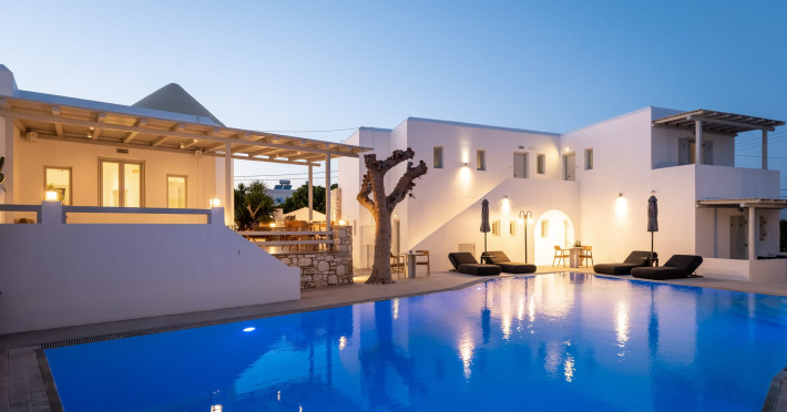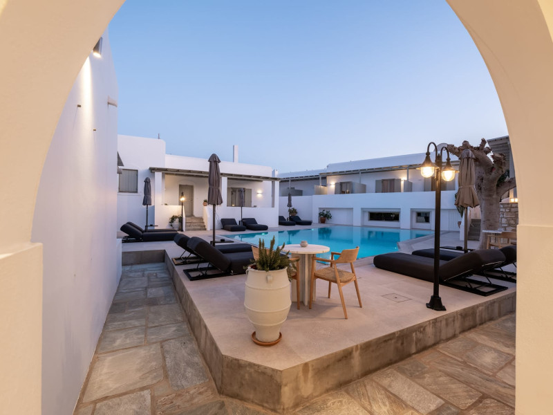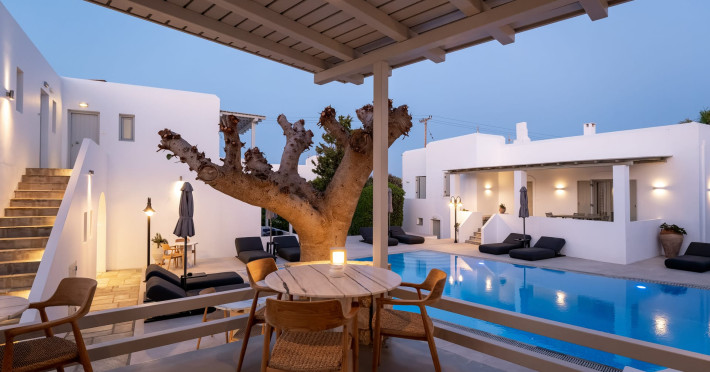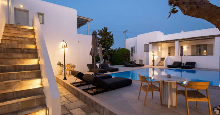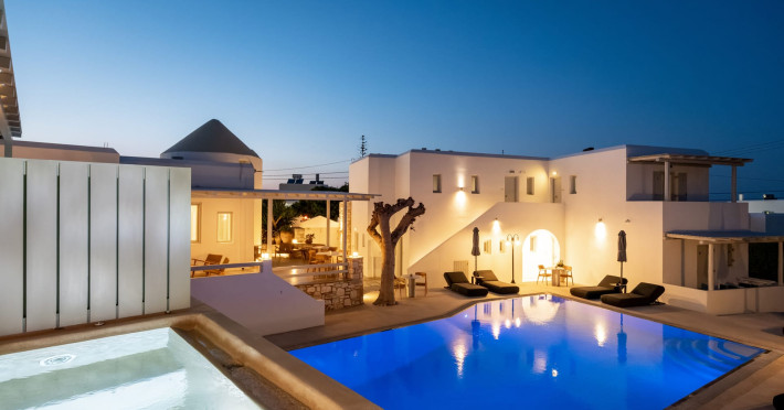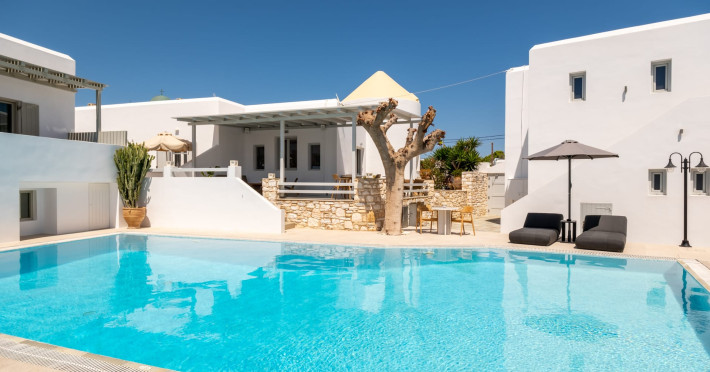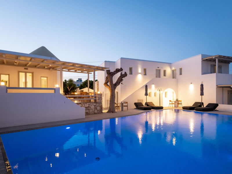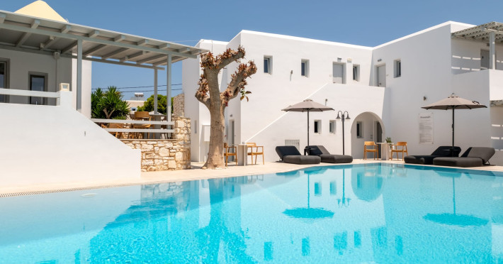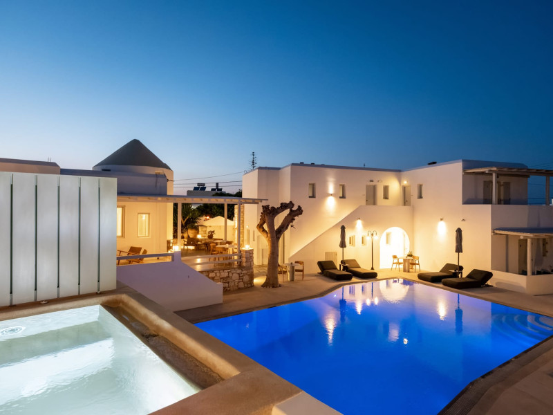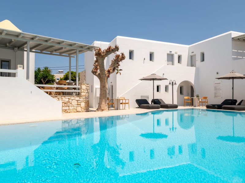 Welcome to Anemomylos Residence and to Naoussa, the most gorgeous village of Paros and one of the nicest villages of Cyclades, worldwide known for the simplicity of its typical Cycladic architecture and its picturesque fishing port. Our complex is a family-run unit consisting of 15 apartments, superior double rooms and superior suites very well attentive and distinguished by their Cycladic architecture and decoration. The spacious apartments, rooms and suites combined with the services we offer are the guarantees for high-quality, comfortable and carefree vacation.The excellent location of Anemomylos Residence and its outer space that gives the traveller a sense of an inner courtyard of a summer house, sets us apart from most of accommodations in Naoussa. The pool area surrounded by beautiful trees and flowers will make you feel that you are in a true private oasis so close to the village center.The Thirty Years' experience in the tourism sector, the immediacy and discretion of us and our staff will make you feel so cozy like home.Our apartments, rooms and suites can accommodate from 2 to 5 persons, perfect accommodation for both families and couples.Anemomylos consists the ideal basis for exploring the island and swim into its crystal clear waters.