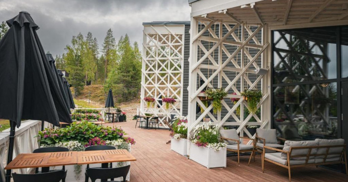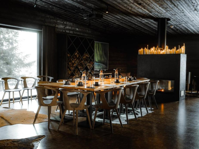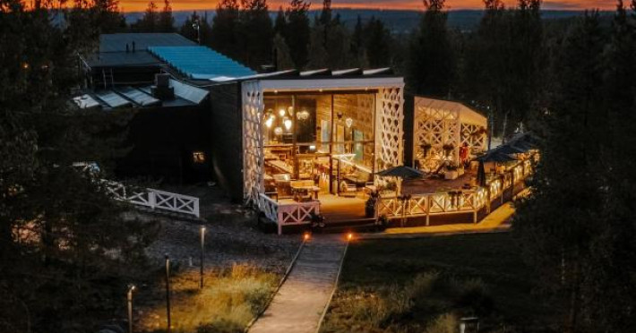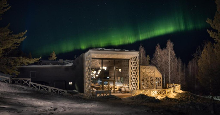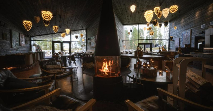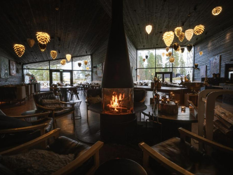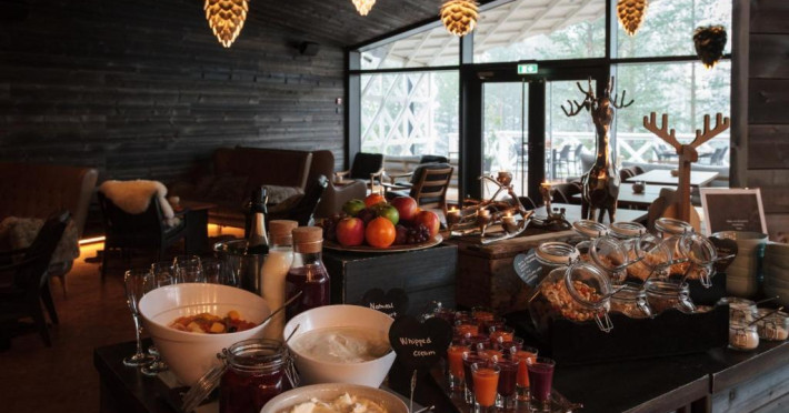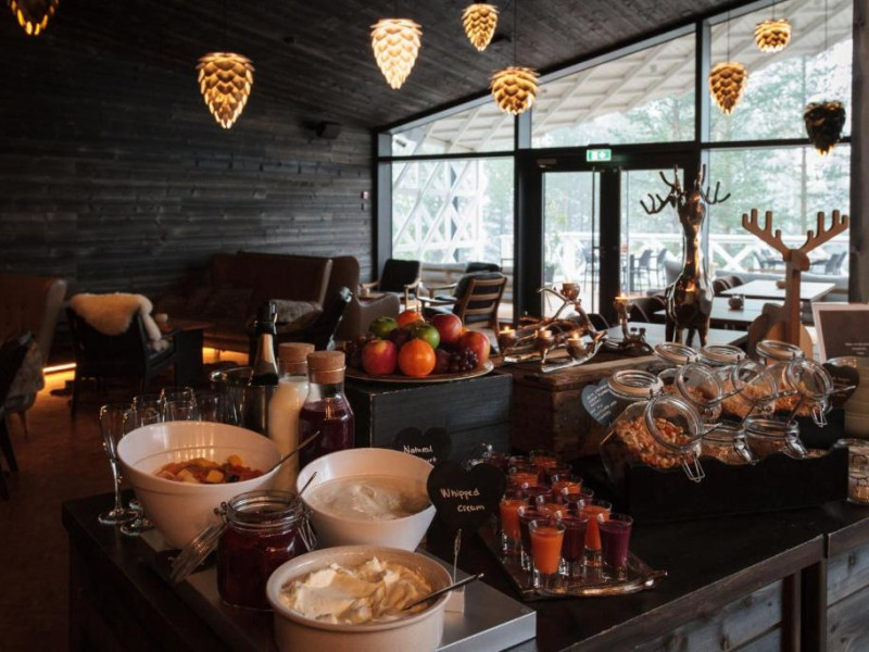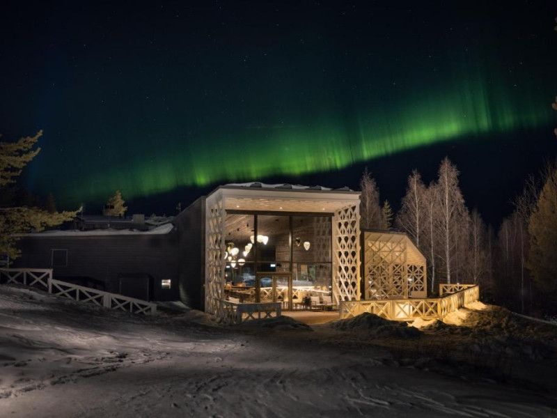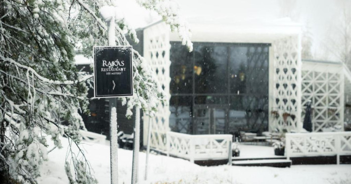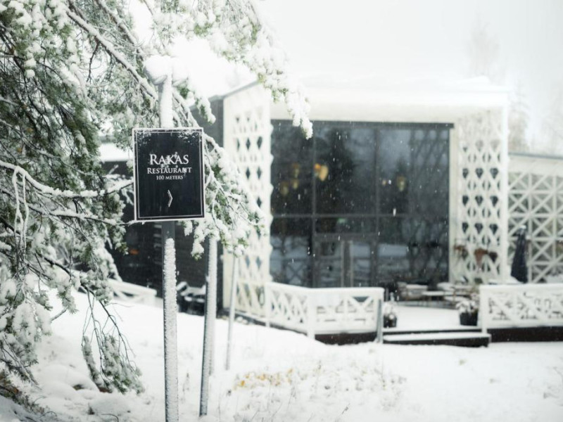 Situat la doar 3 km de Satul lui Moș Crăciun, hotelul dispune de un restaurant à la carte care servește specialități nordice rafinate, preparate din ingrediente locale. Rakas Restaurant & Bar oferă o atmosferă intimă cu vedere spre pădure.