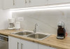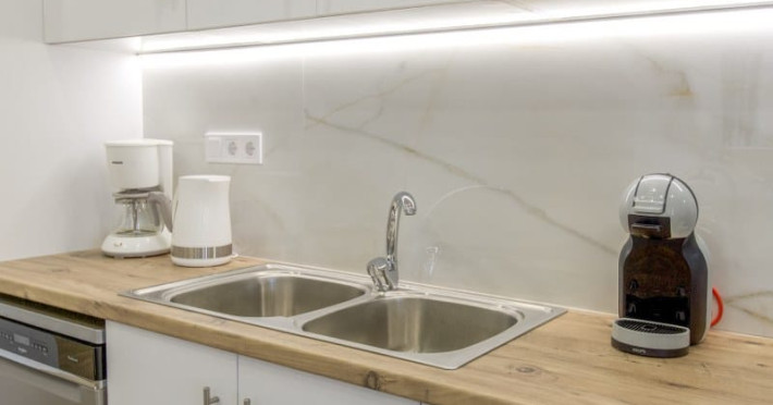 The kitchen is fully equipped with a large fridge, oven, ceramic hob and dishwasher.