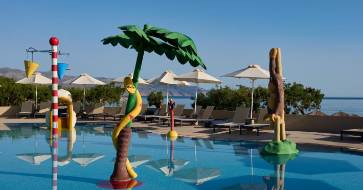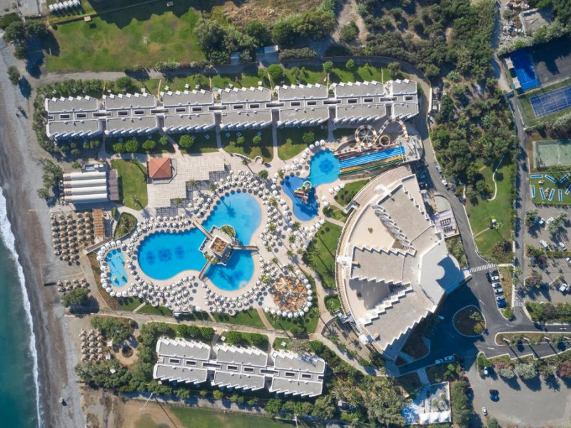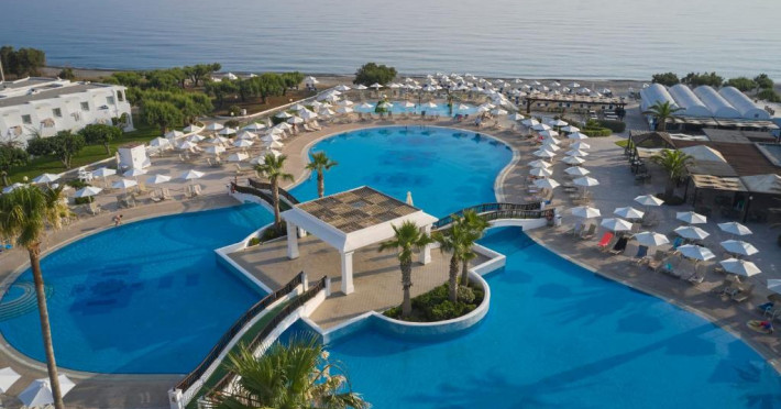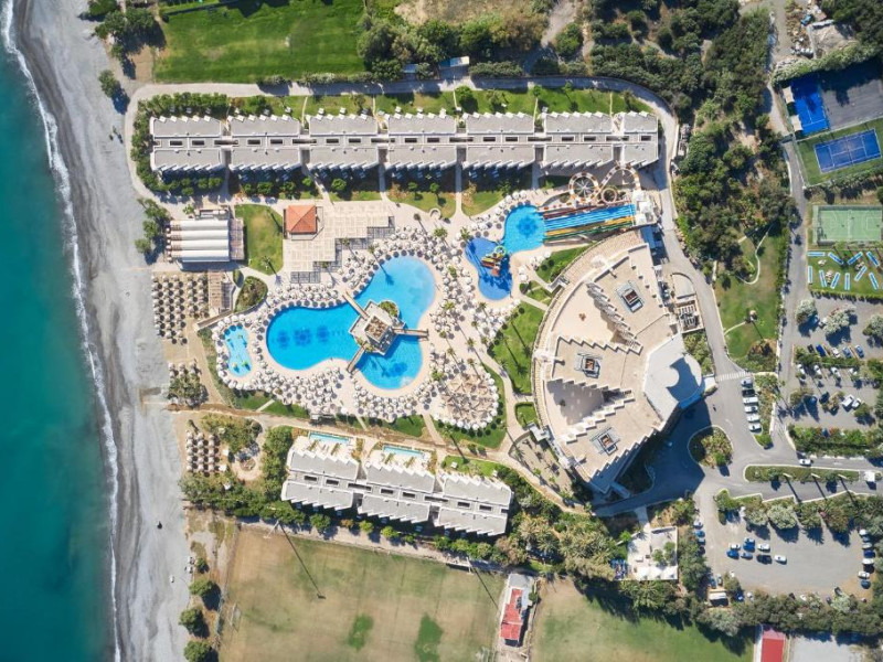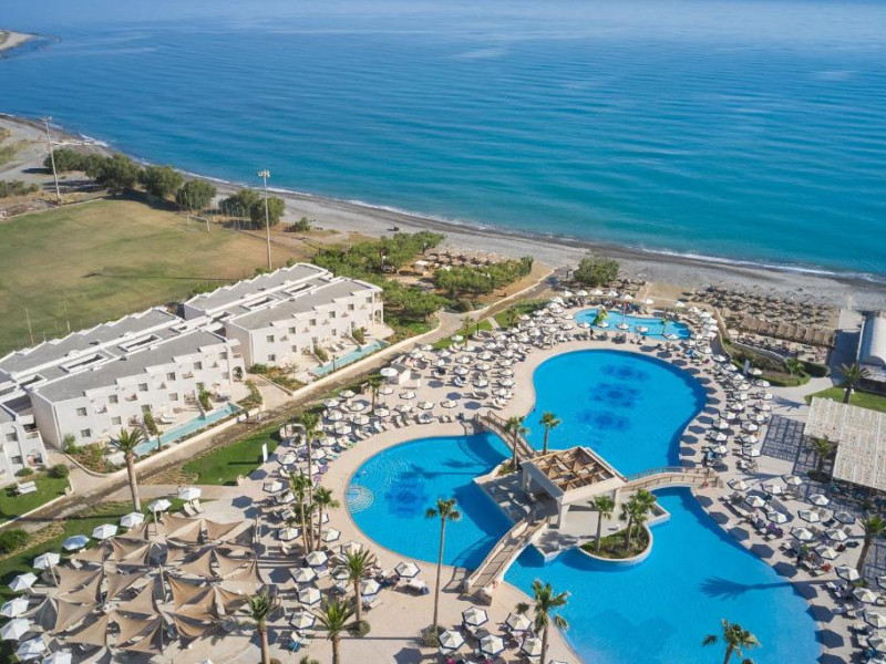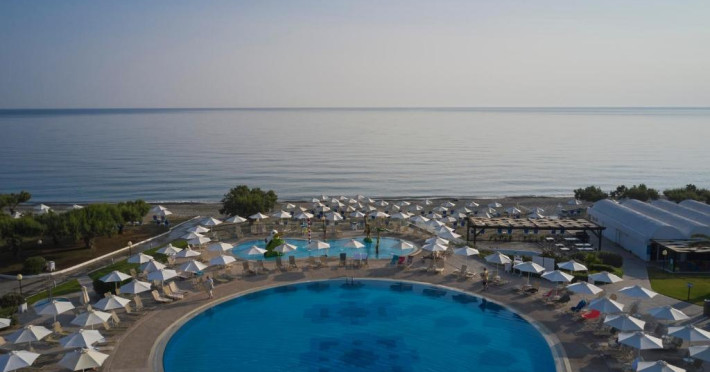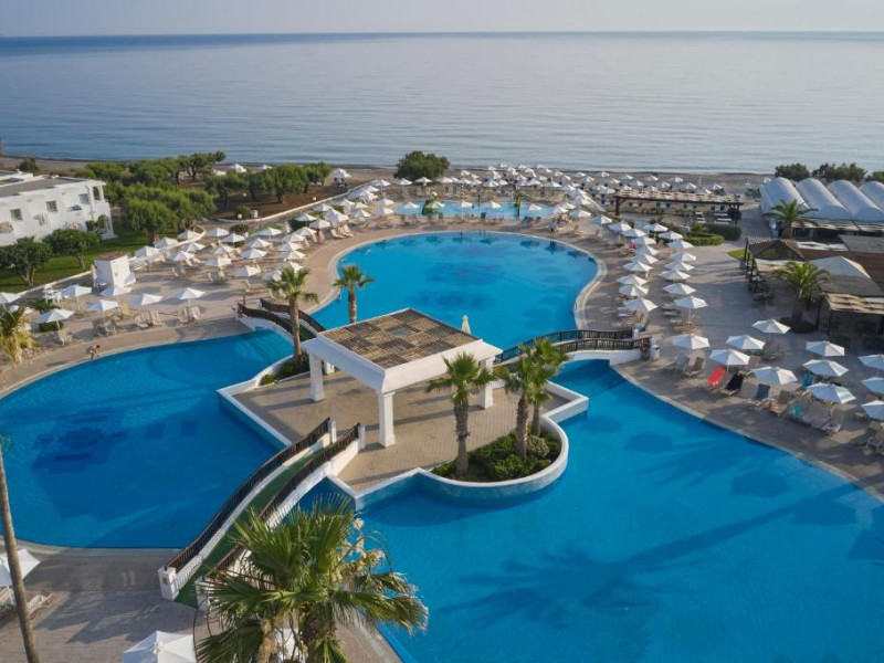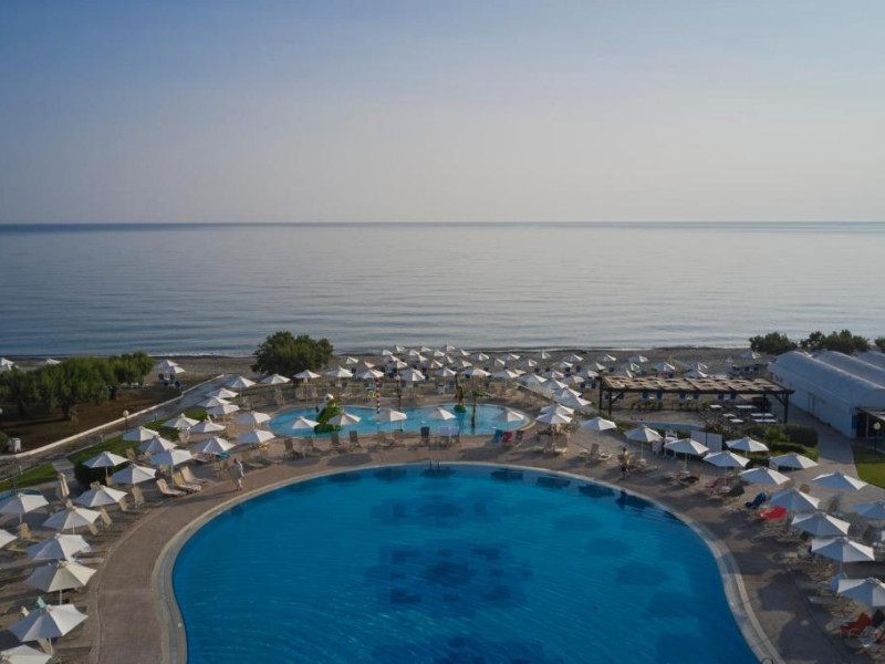 Resortul dispune de 3 piscine exterioare, inclusiv o zonă dedicată copiilor, și un restaurant principal cu terasă ce servește preparate grecești și internaționale. Oaspeții se pot bucura de acces direct la plajă, unde sunt disponibile șezlonguri și umbrele.