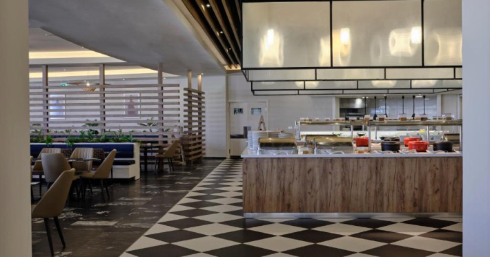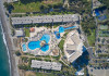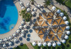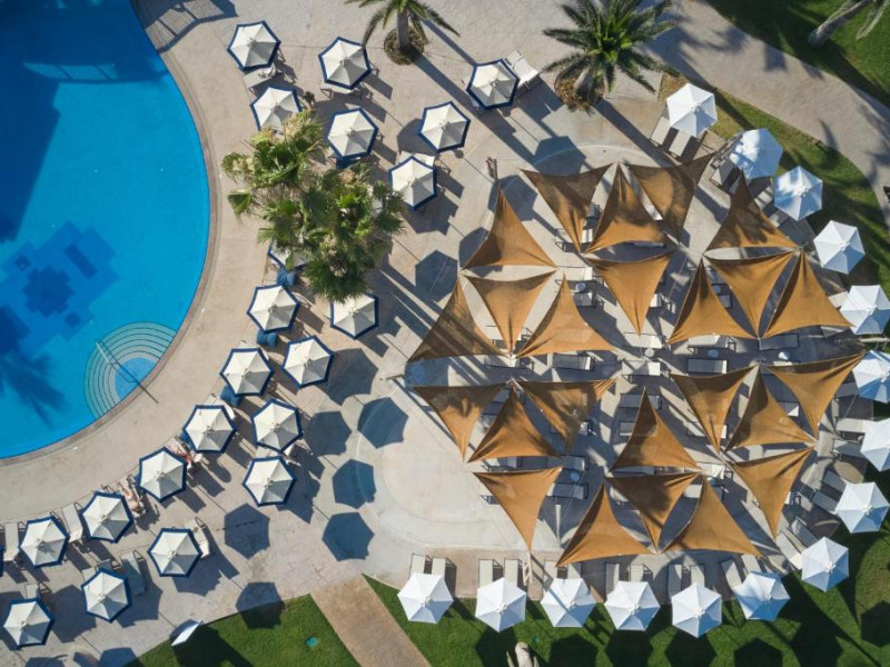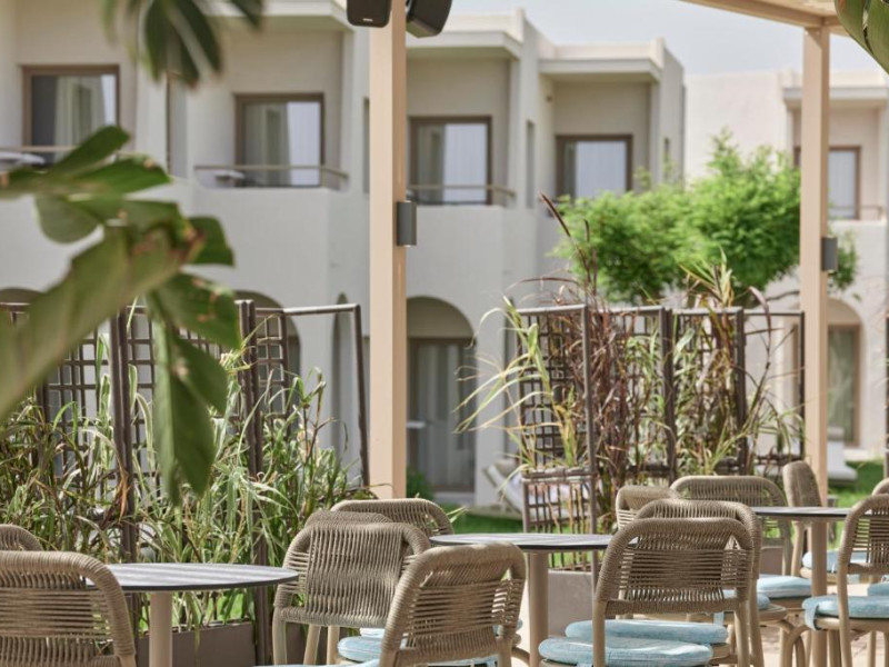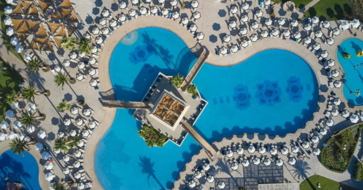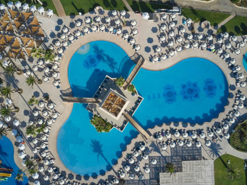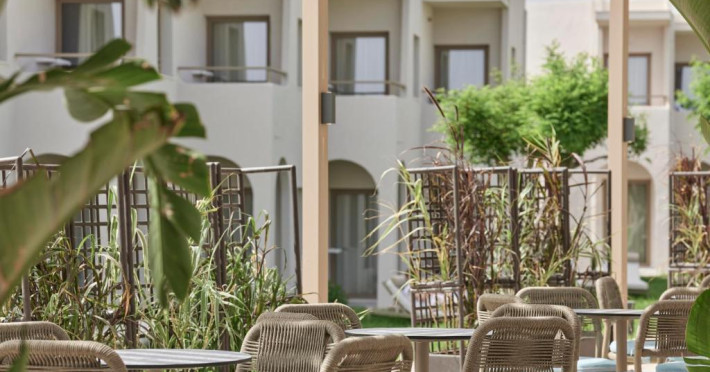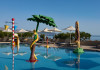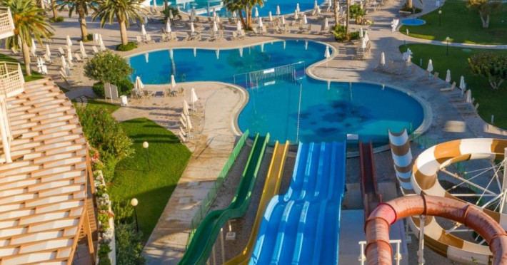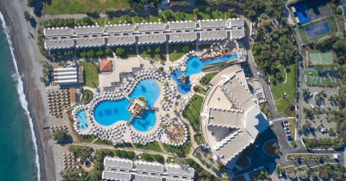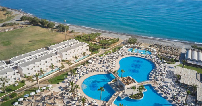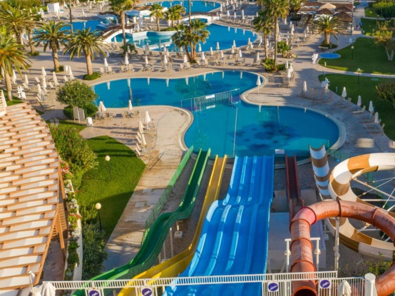 Resortul dispune de 3 piscine exterioare, inclusiv o zonă dedicată copiilor, și un restaurant principal cu terasă ce servește preparate grecești și internaționale. Oaspeții se pot bucura de acces direct la plajă, unde sunt disponibile șezlonguri și umbrele.
