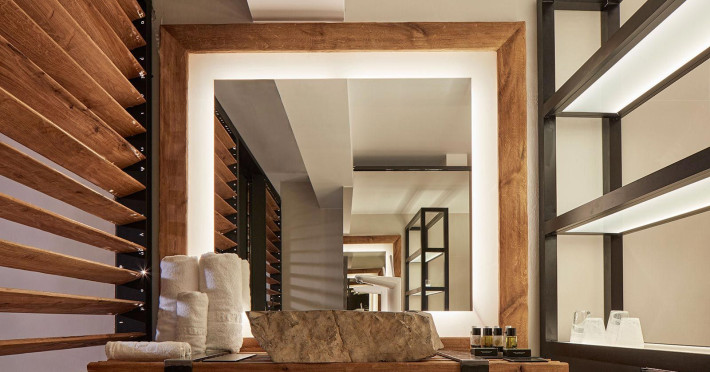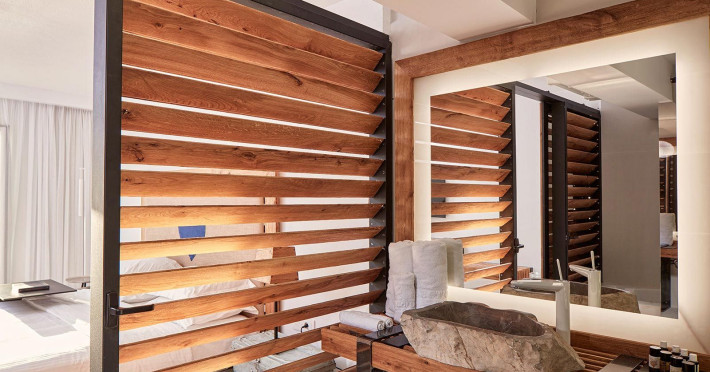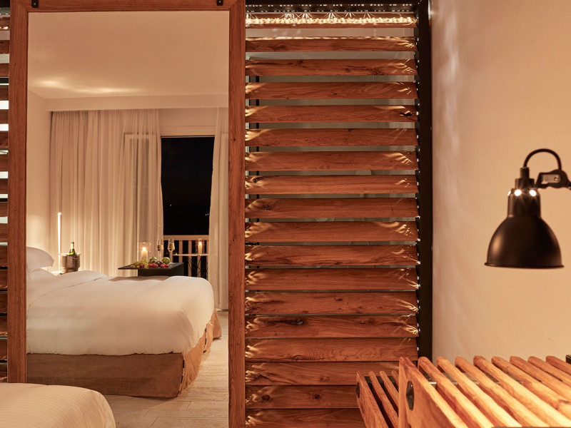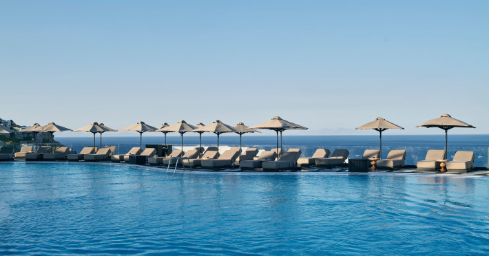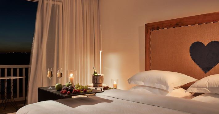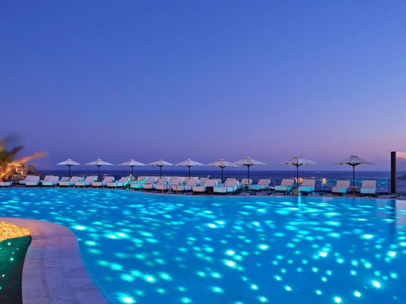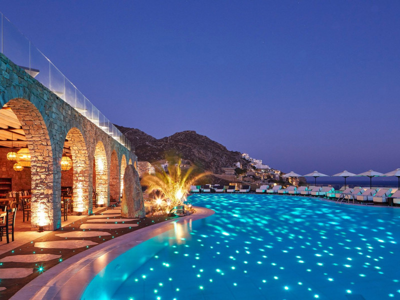 Its illuminated rustic façade of Cycladic stone is a stage curtain to the journey of discovery conceived by a celebrated Greek set designer, who takes his cues from a blend of antiquity and new age fantasy. His interpretation of luxury hospitality lends drama to contemporary interiors and vast entertainment decks from which to enjoy the magnificent spectacle of Aegean sunlight and starry nights that unfolds throughout the day to the horizon line. Spacious rooms are furnished to luxury standards and completed by private infinity pools and Jacuzzis, a secluded private beach, exclusive spa and Mediterranean gourmet cuisine.