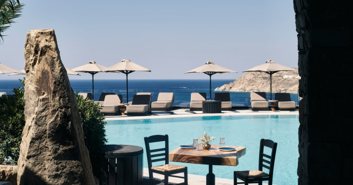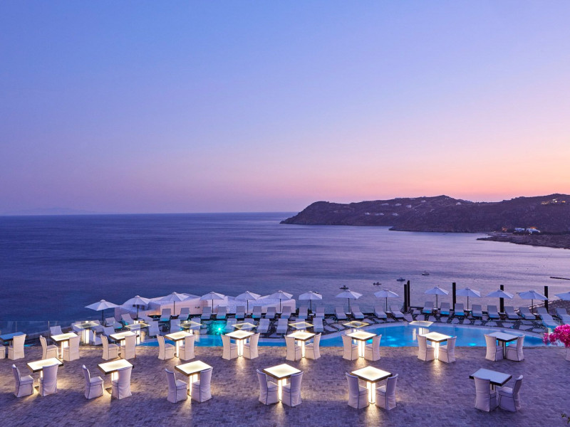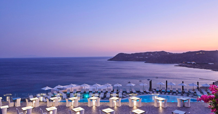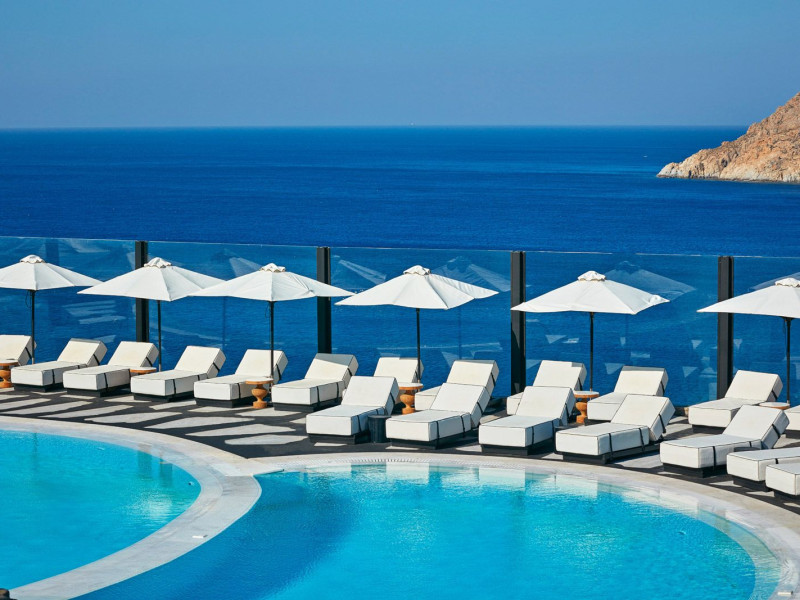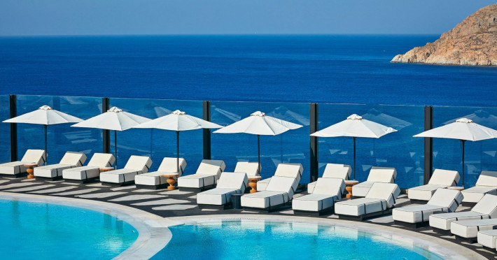 Poised high on the ridge of the hillside, the Royal Myconian luxury resort commands spectacular views over the bay of Elia’s broad swathe of golden sand and turquoise sea.
