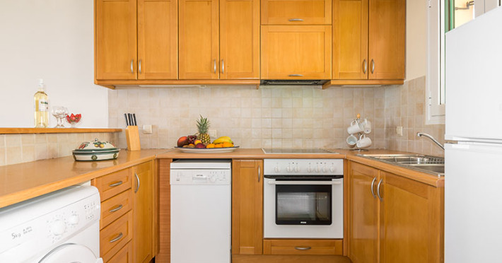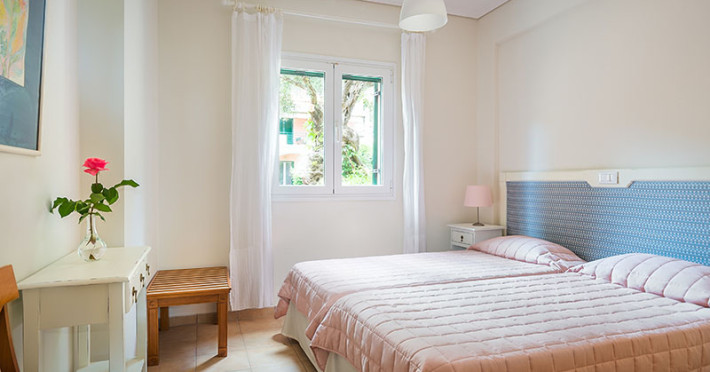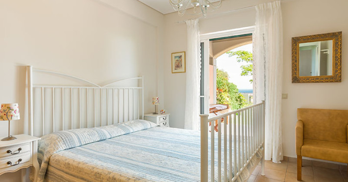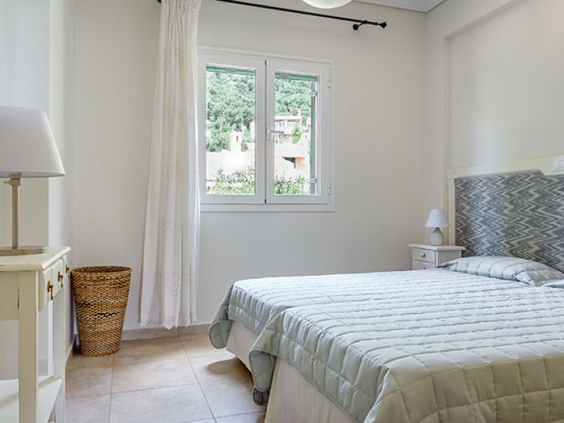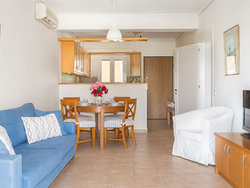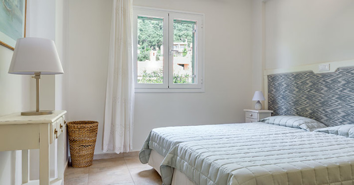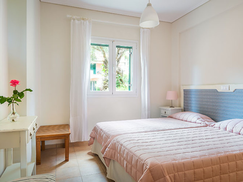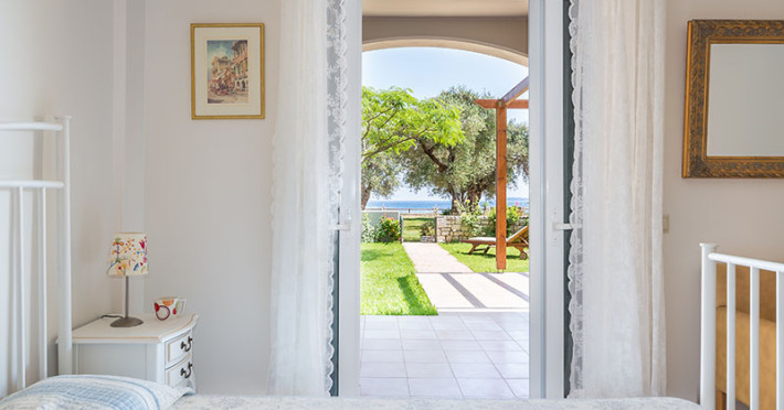 Each apartement consists of two comfortable bedrooms, the first features one double bed and the second feautres two single beds, one bathroom, a living room/dining area where the 5th person can be accommodated, a fully equipped kitchen and a gorgeous private garden with bushes and flowers or a wonderful balcony with sea view.