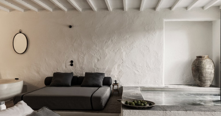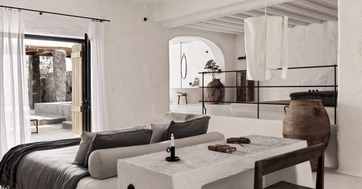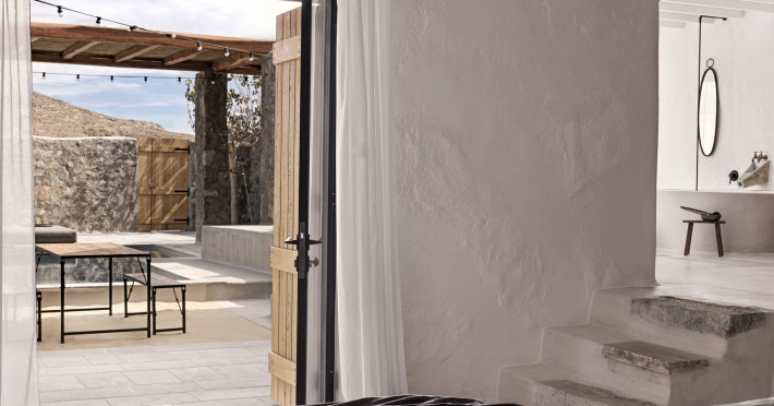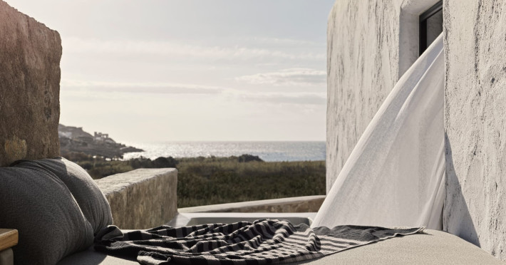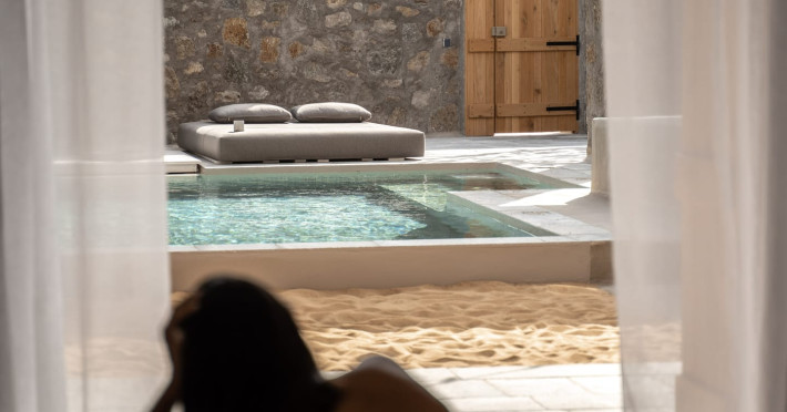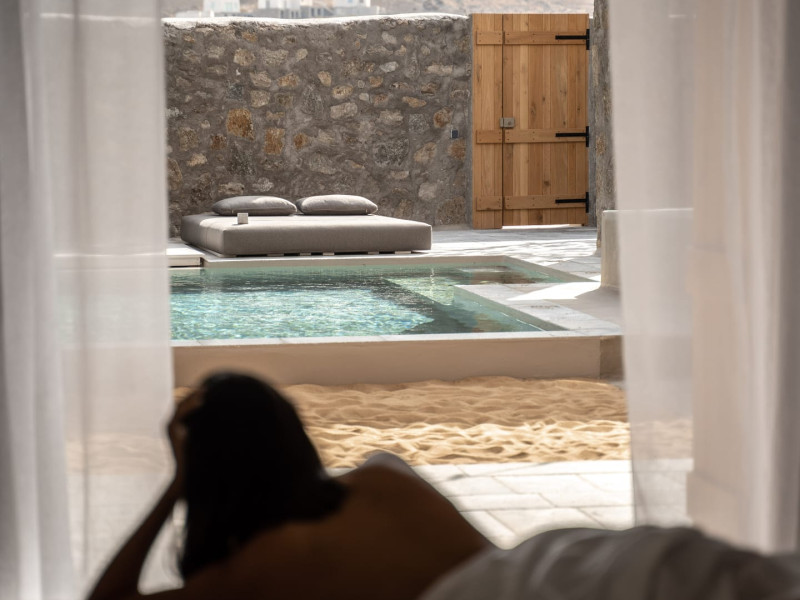 Aiming to make the most out of the sunshine and the starry skies, NOMAD lies just 200m from one of the most beautiful beaches on the island, Kalo Livadi. A brand-new property, consisted of 14 private unique suites, that will bring guests closer to the rustic life of the island. NOMAD’s guests can experience the Old Mykonos while spending their days and nights in their private terrace with outdoor pool and/or hot tub taking advantage of our discreet high-end service, liberating body and mind.Due to the particular construction of the hotel, for safety reasons, children below the age of 13 are not allowed.