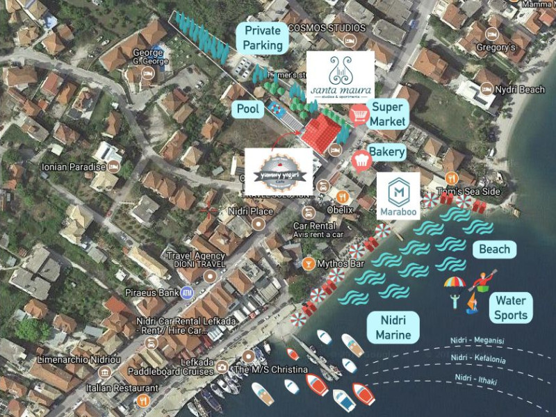 Studios and apartments.Just 50 m from the pebbled Nydri Beach, Santa Maura offers air-conditioned, self-catered accommodation. Studios feature balconies overlooking the pool or Mount Elati or hotel gardens. Drinks and frozen yoghurt are served at the on-site bar.Each studio at the Santa Maura includes a well-equipped kitchenette with fridge. Satellite LCD TV and free Wi-Fi access are offered in all units.Guests can relax at the sun terrace, by the pool. The in-house tour desk can provide helpful information to further explore the island of Lefkada.