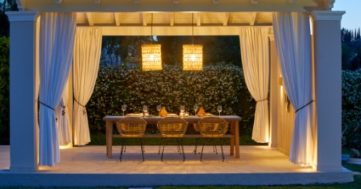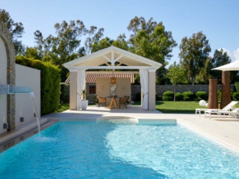 are sun beds and umbrellas, as well as a gazebo with outdoor sitting for 6, an