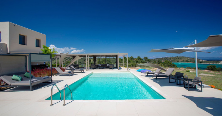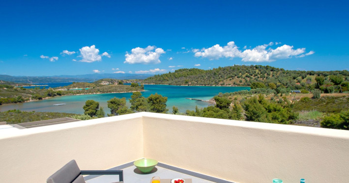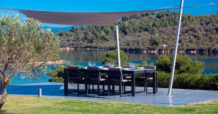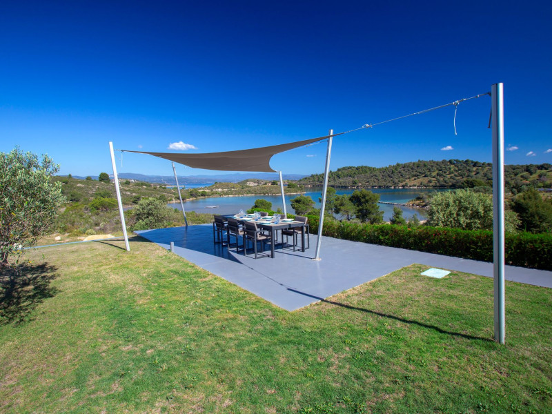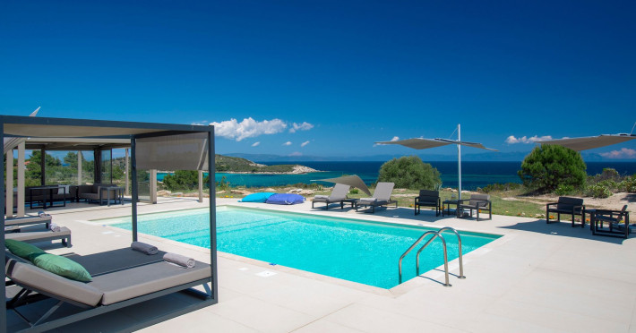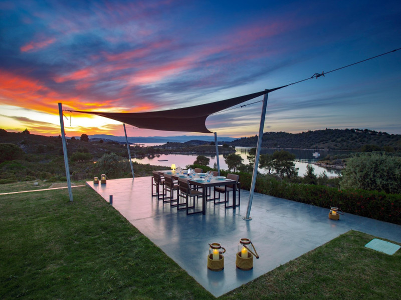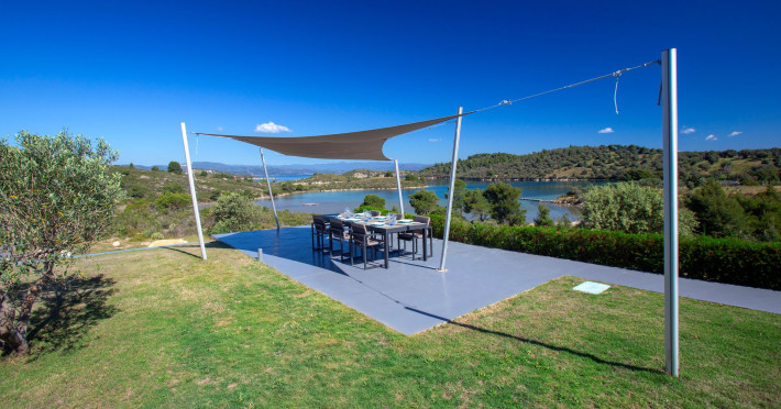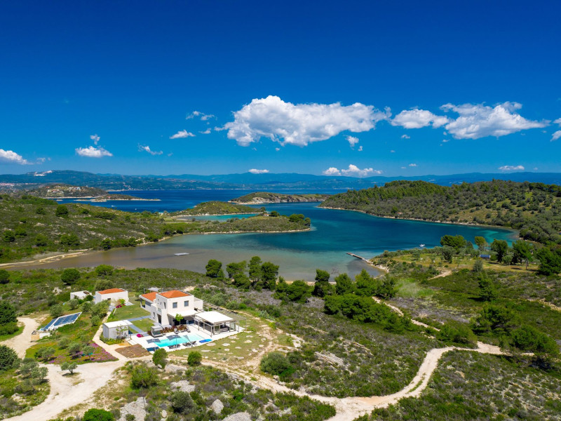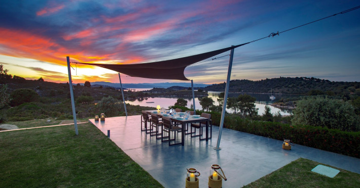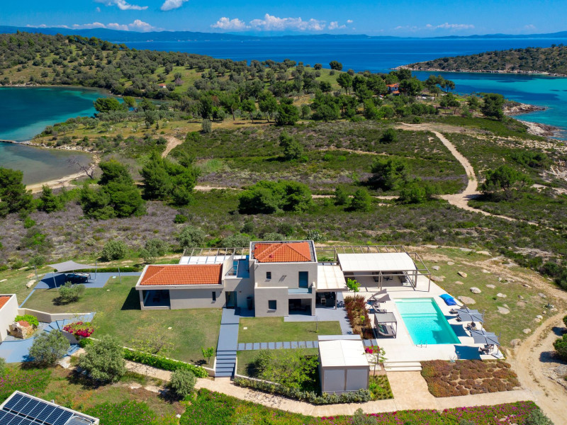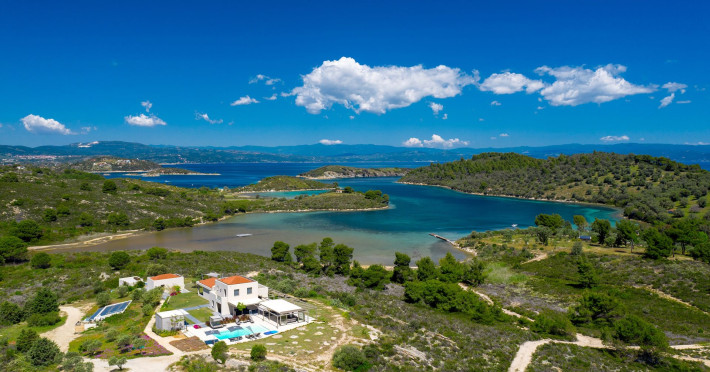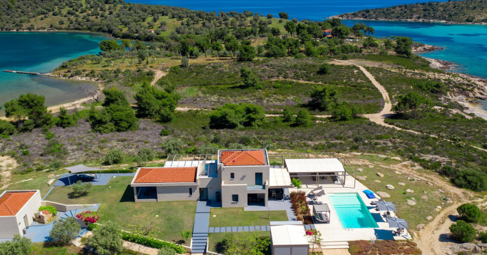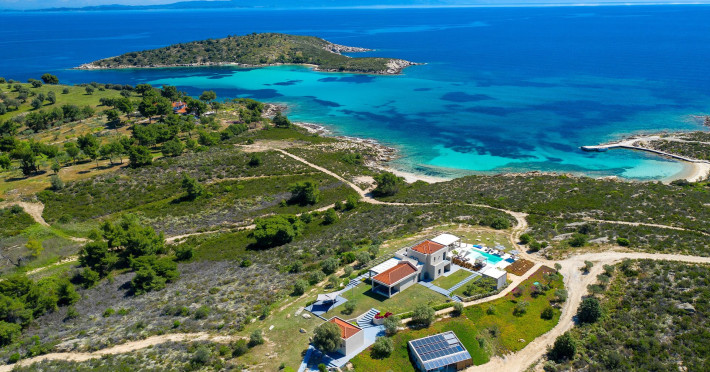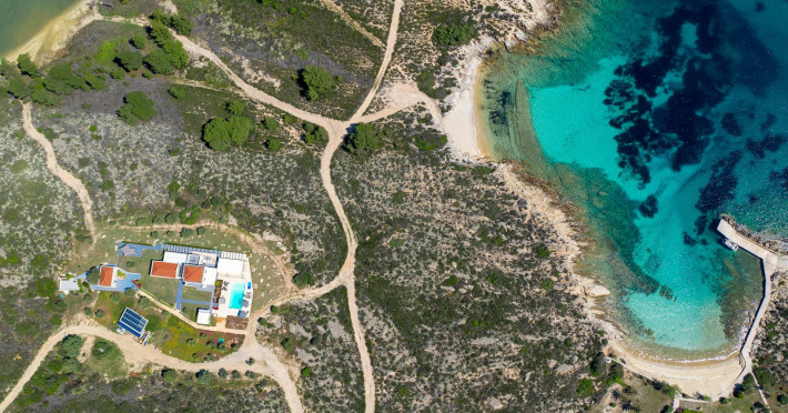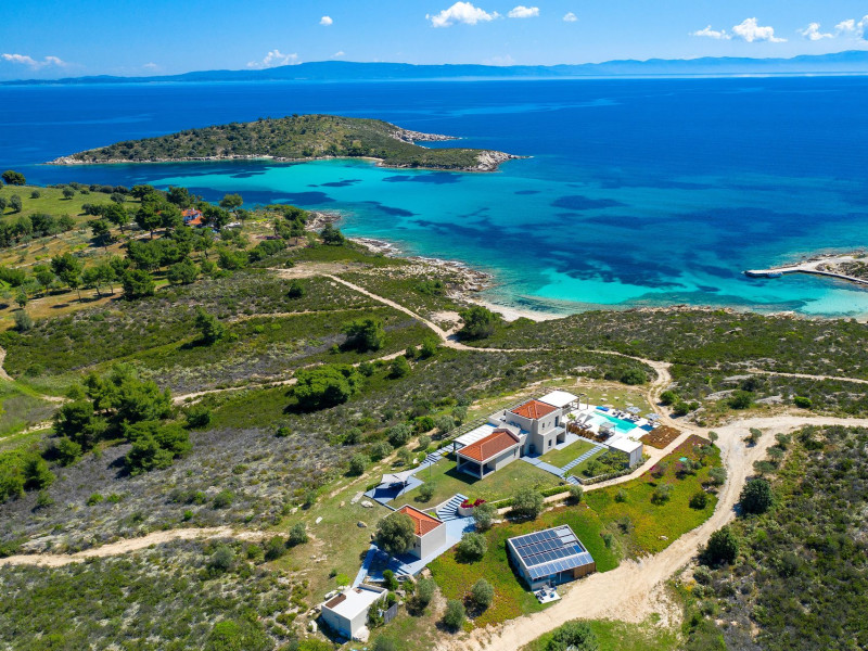 The Villas are located in a new secret eco-paradise on the second of the three peninsulas of Halkidiki, in Greece, in the North Aegean Sea. Diaporos Island is opposite Vourvourou and only 10 km from the municipality of Agios Nikolaos in Sithonia. The area covers 3,2 square kilometers with a big natural bay, which is 700 meters long and serves as a mooring spot for the boats. The bay ends in shallow watres that always remain warm and are therefore suitable for swimmers. Most of the island is covered by pie forest, which makes it a unique combination of perfect coast lines and pure nature.