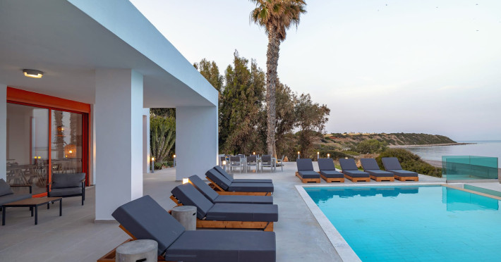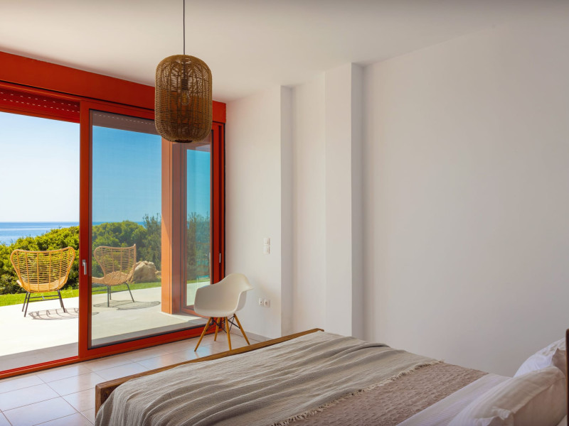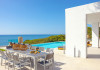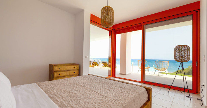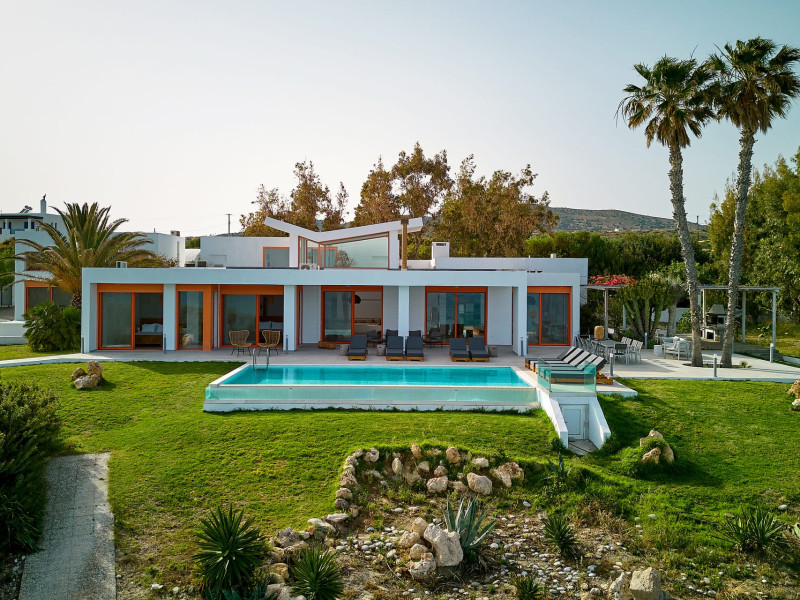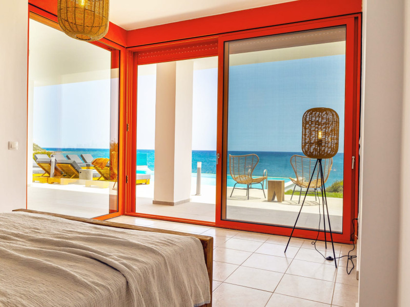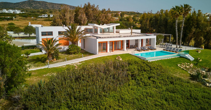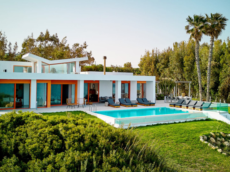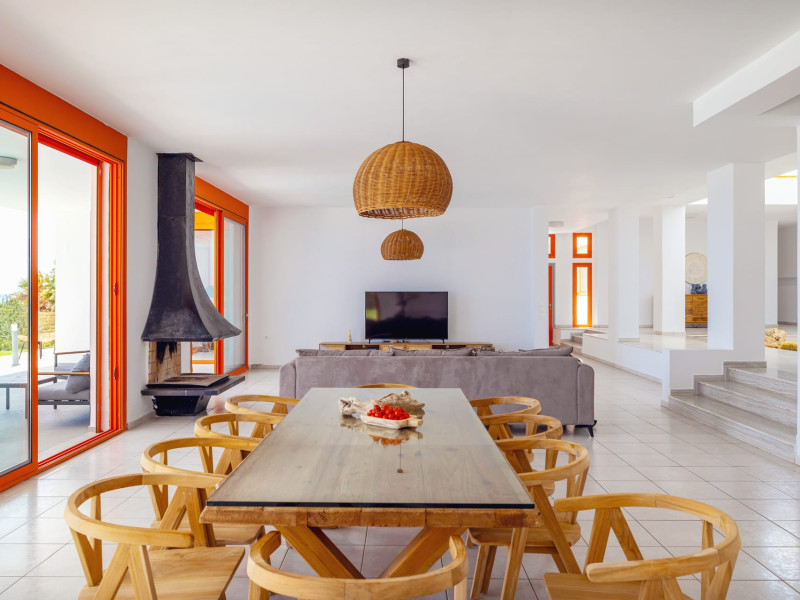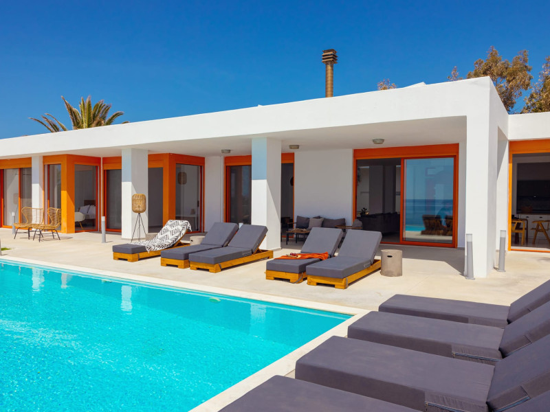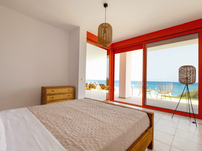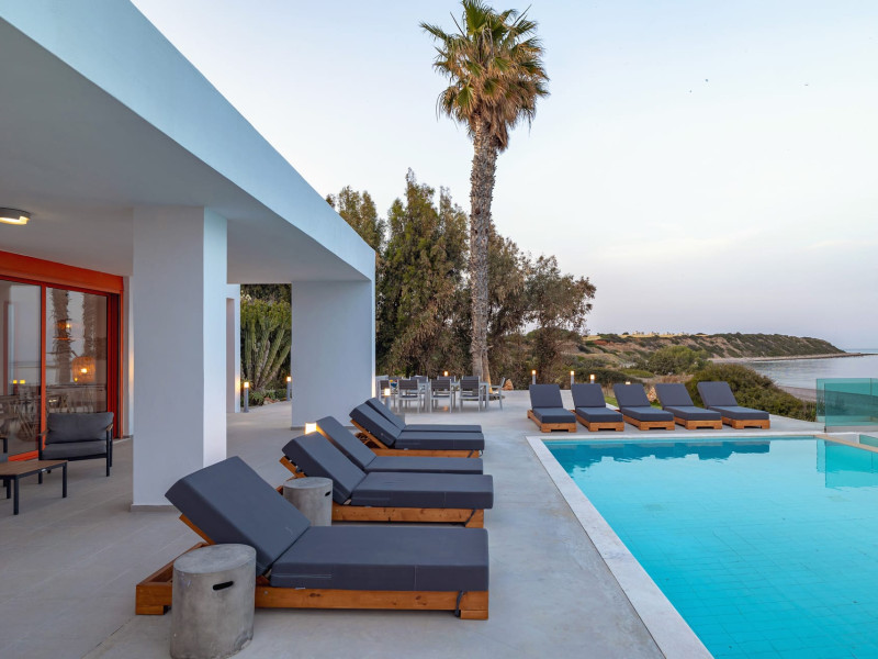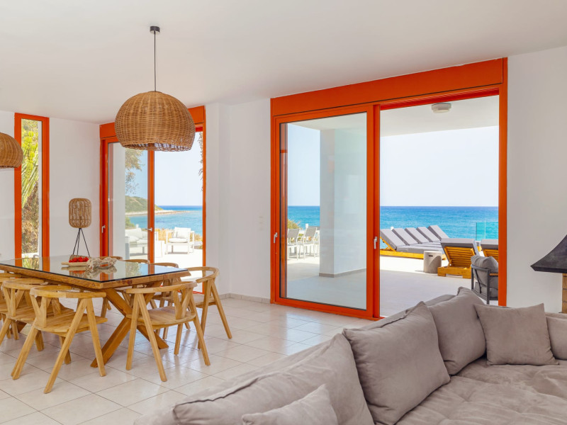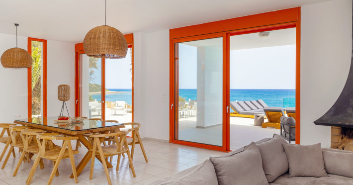 A waterfront 550m2 Villa with 7 spacious double bedrooms offering beautiful sea view as well as one outdoor pool (50 sqm-1.30-1.70 depth). Villa Seven comfortably accommodates up to 14 people and offers individual A/C and heating in 6 bedrooms, spacious living room area with TV (Satellite /Cable) and fireplace for winter months, fully equipped modern kitchen and dining area with baby sit, 7 bathrooms with shower, cosmetic mirror, bathroom amenities, towels & linen, hairdryers, safety box, balconies and sitting areas, garden, terrace, deck chairs and umbrellas, full sea view from all spaces of the property. Welcome basket with local drinks and homemade products upon arrival.