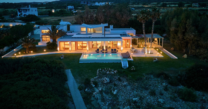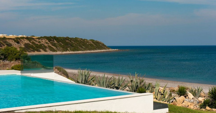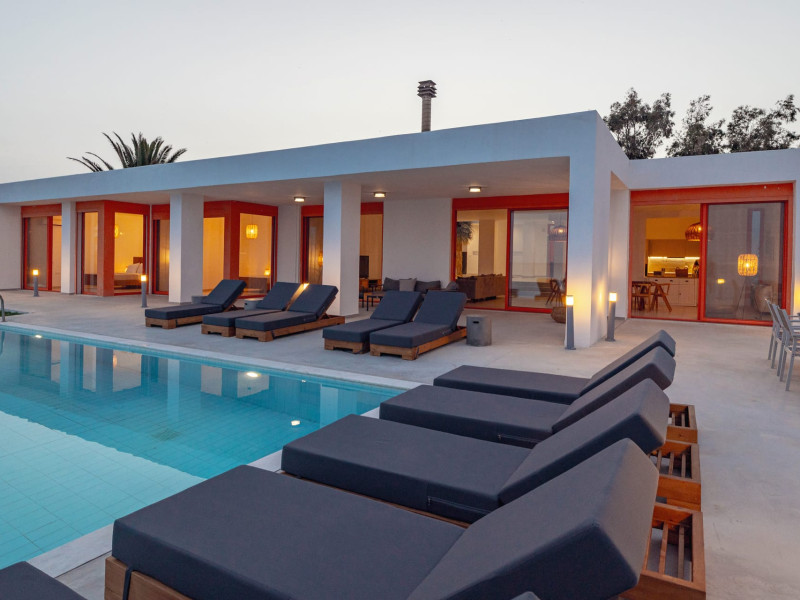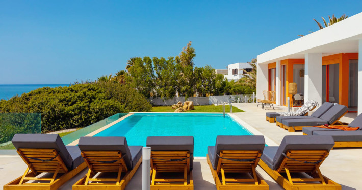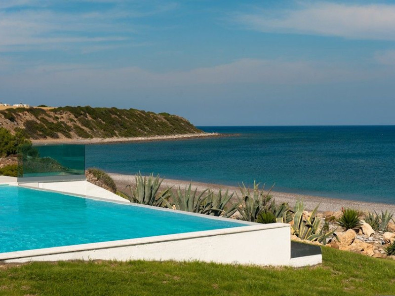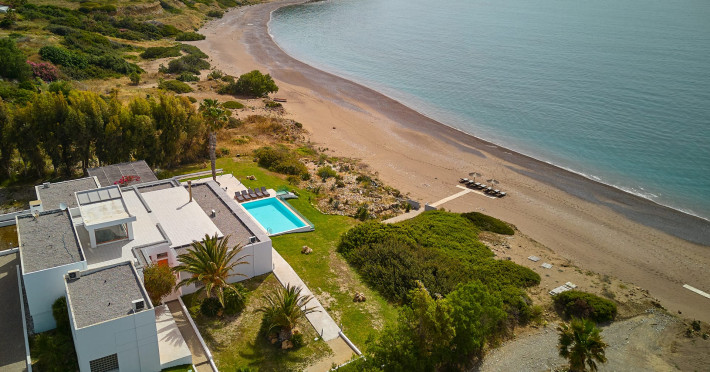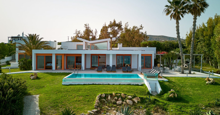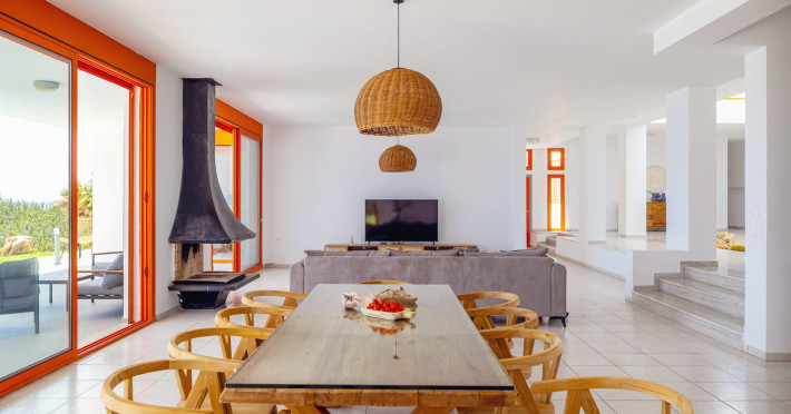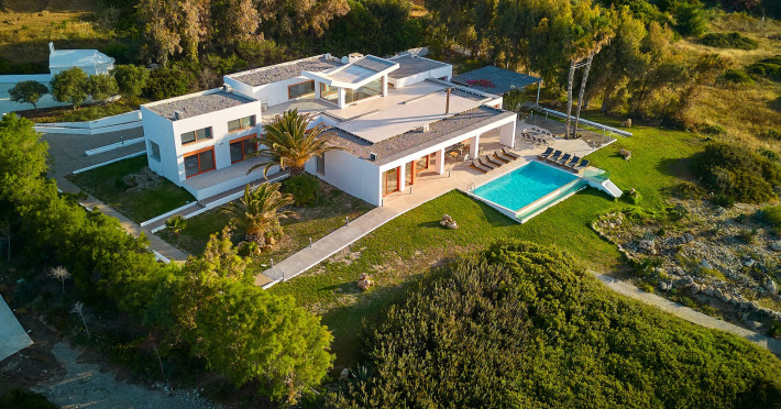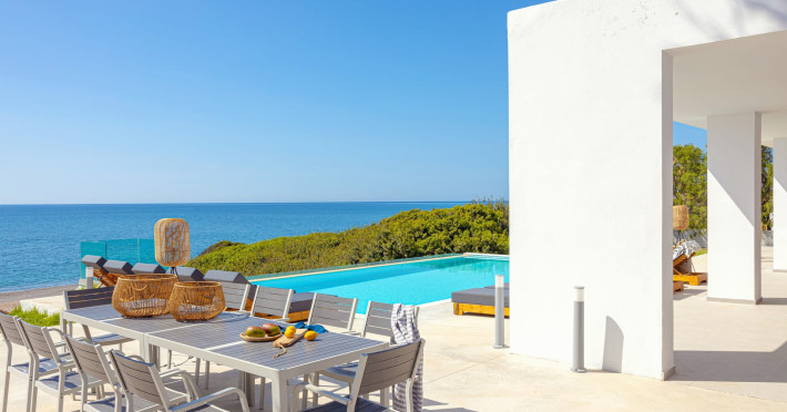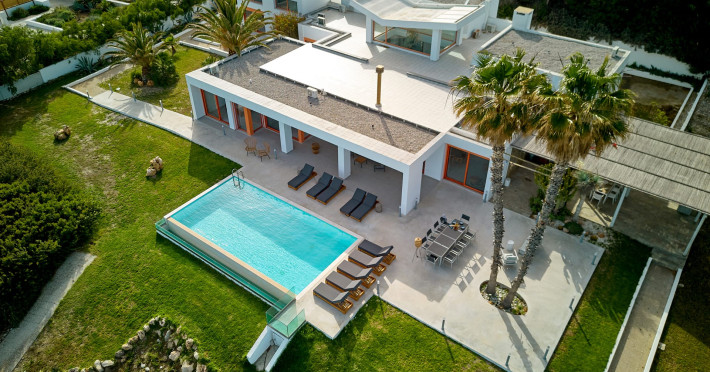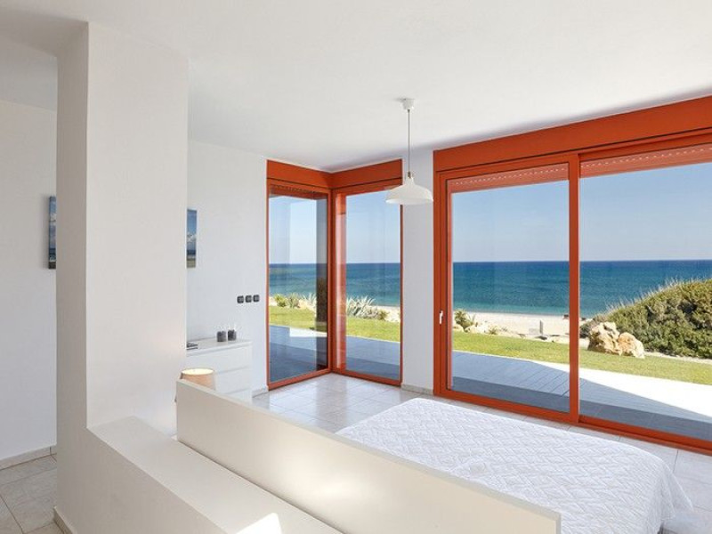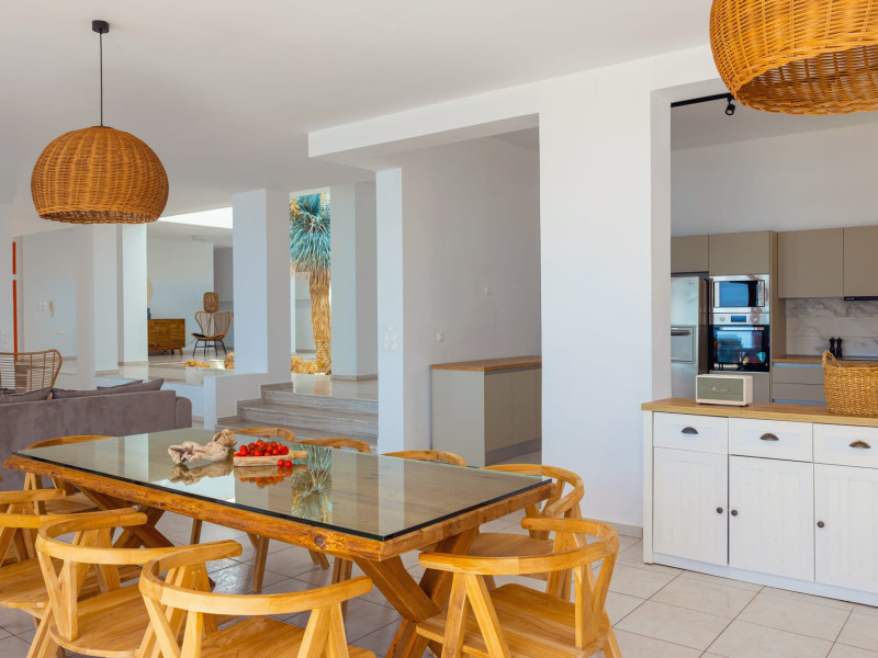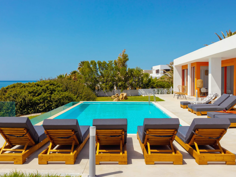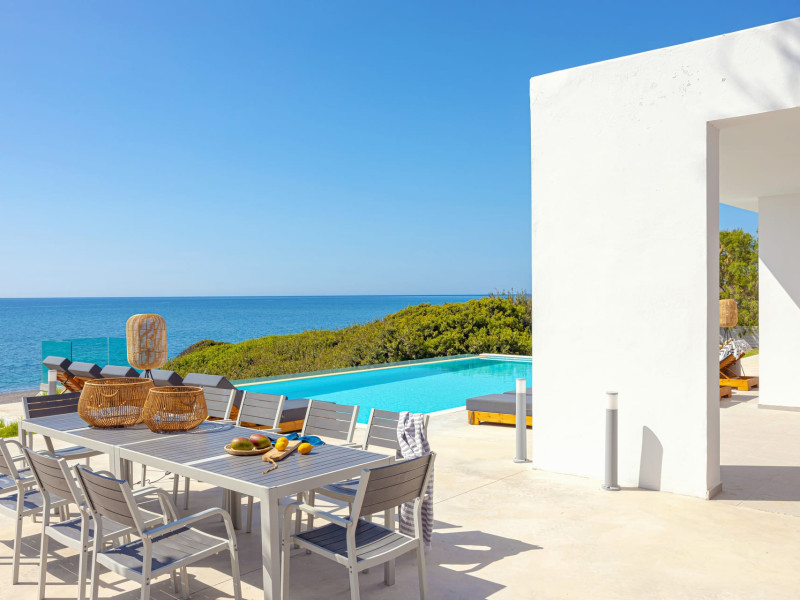 A waterfront 550m2 Villa with 7 spacious double bedrooms offering beautiful sea view as well as one outdoor pool (50 sqm-1.30-1.70 depth). Villa Seven comfortably accommodates up to 14 people and offers individual A/C and heating in 6 bedrooms, spacious living room area with TV (Satellite /Cable) and fireplace for winter months, fully equipped modern kitchen and dining area with baby sit, 7 bathrooms with shower, cosmetic mirror, bathroom amenities, towels & linen, hairdryers, safety box, balconies and sitting areas, garden, terrace, deck chairs and umbrellas, full sea view from all spaces of the property. Welcome basket with local drinks and homemade products upon arrival.