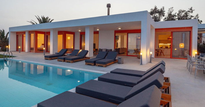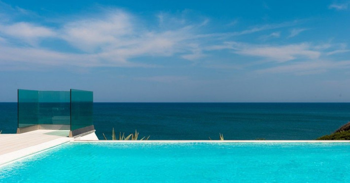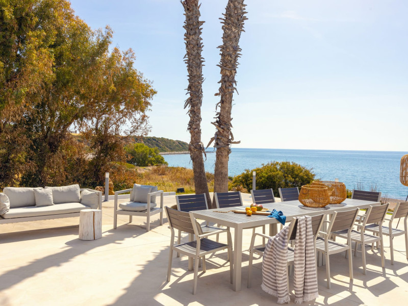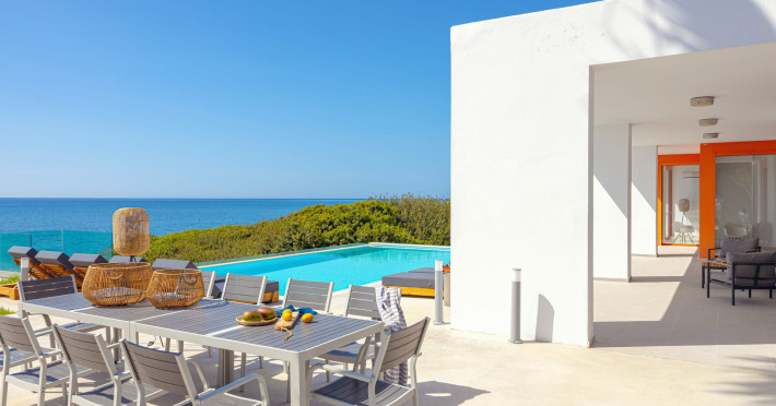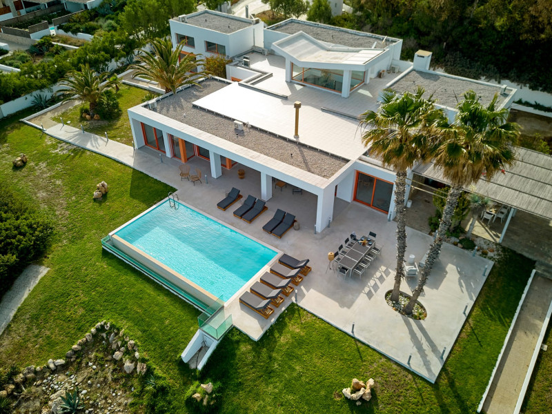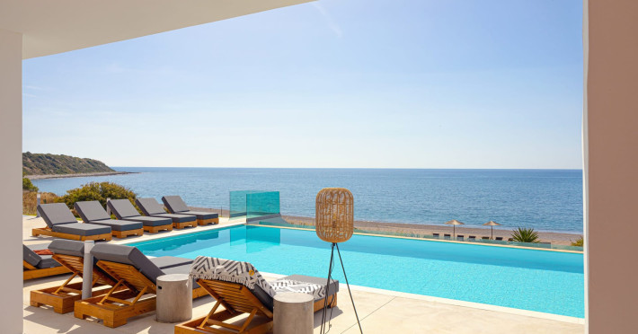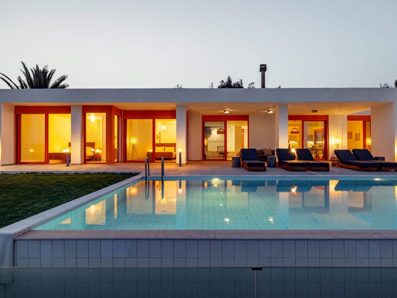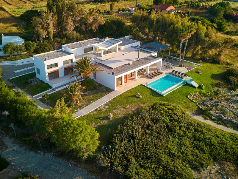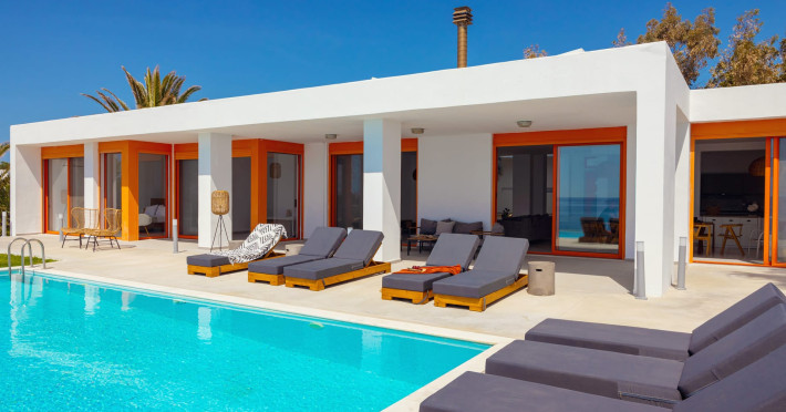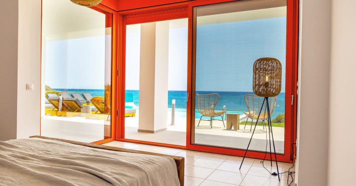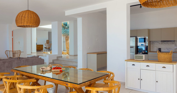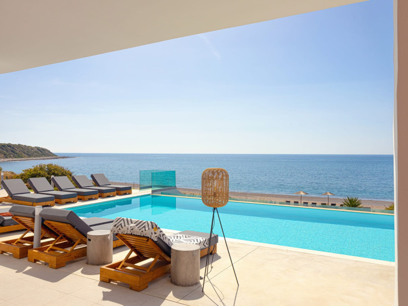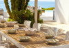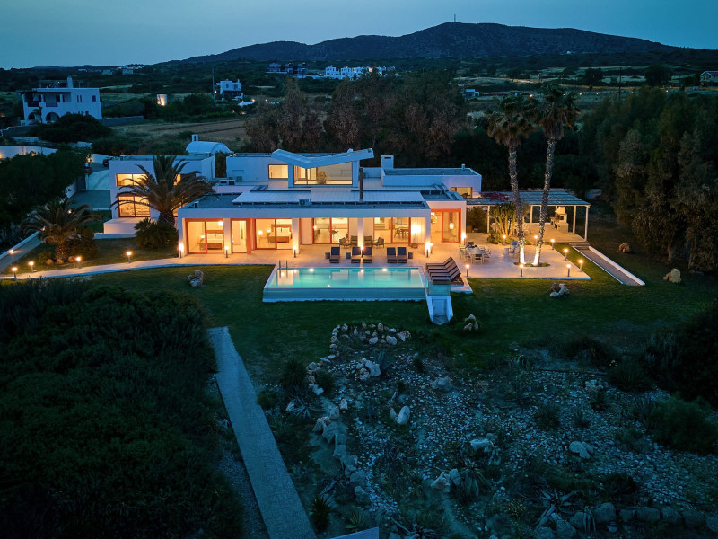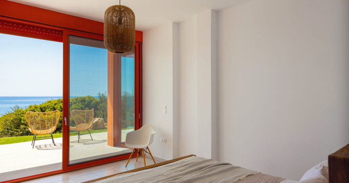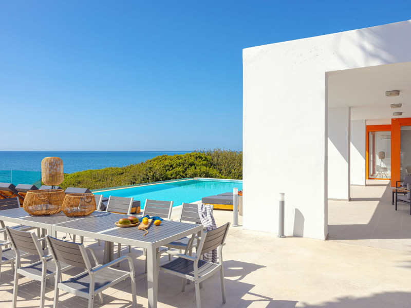 A waterfront 550m2 Villa with 7 spacious double bedrooms offering beautiful sea view as well as one outdoor pool (50 sqm-1.30-1.70 depth). Villa Seven comfortably accommodates up to 14 people and offers individual A/C and heating in 6 bedrooms, spacious living room area with TV (Satellite /Cable) and fireplace for winter months, fully equipped modern kitchen and dining area with baby sit, 7 bathrooms with shower, cosmetic mirror, bathroom amenities, towels & linen, hairdryers, safety box, balconies and sitting areas, garden, terrace, deck chairs and umbrellas, full sea view from all spaces of the property. Welcome basket with local drinks and homemade products upon arrival.