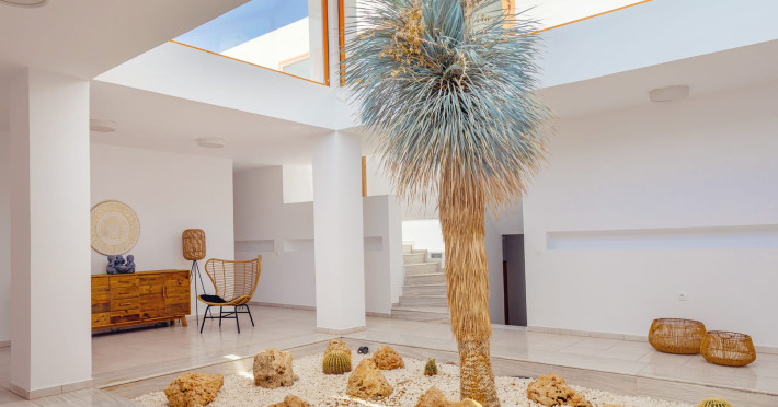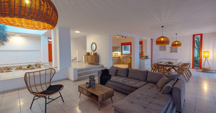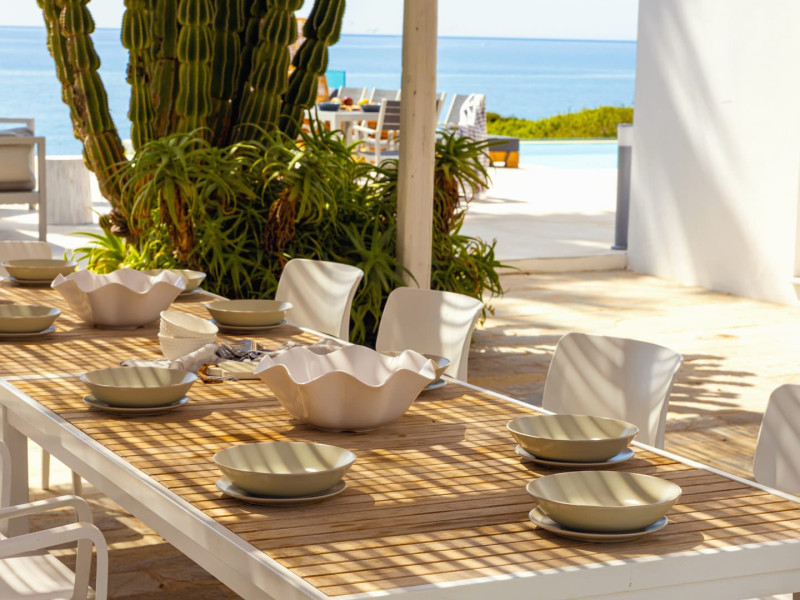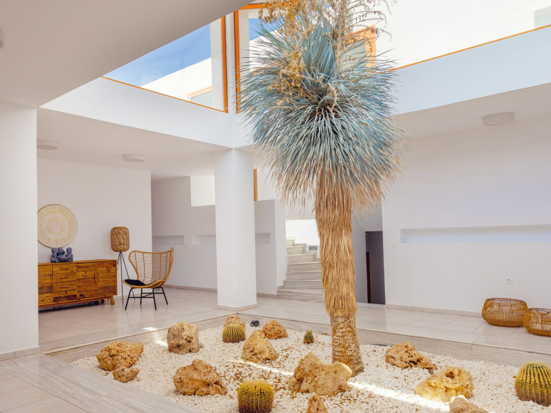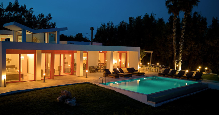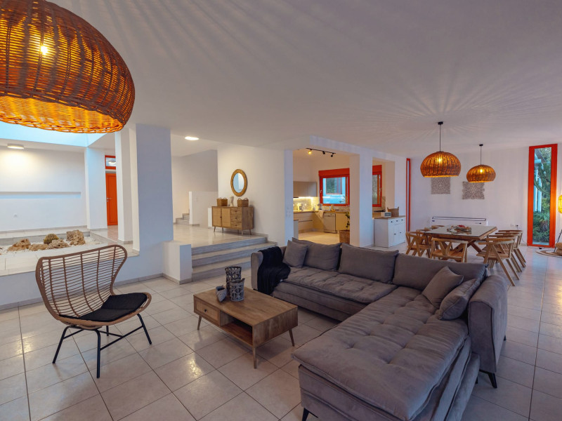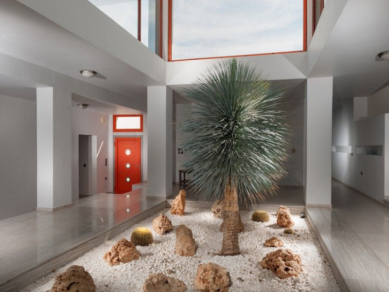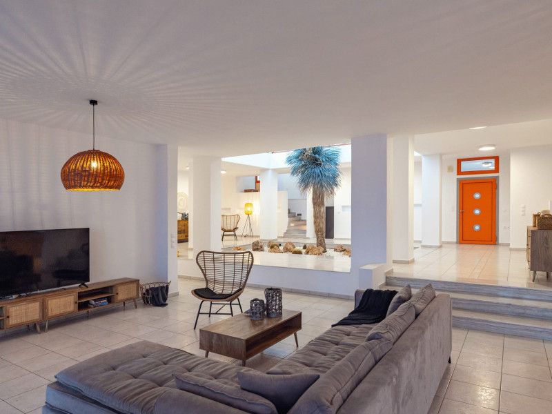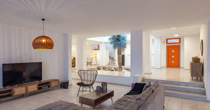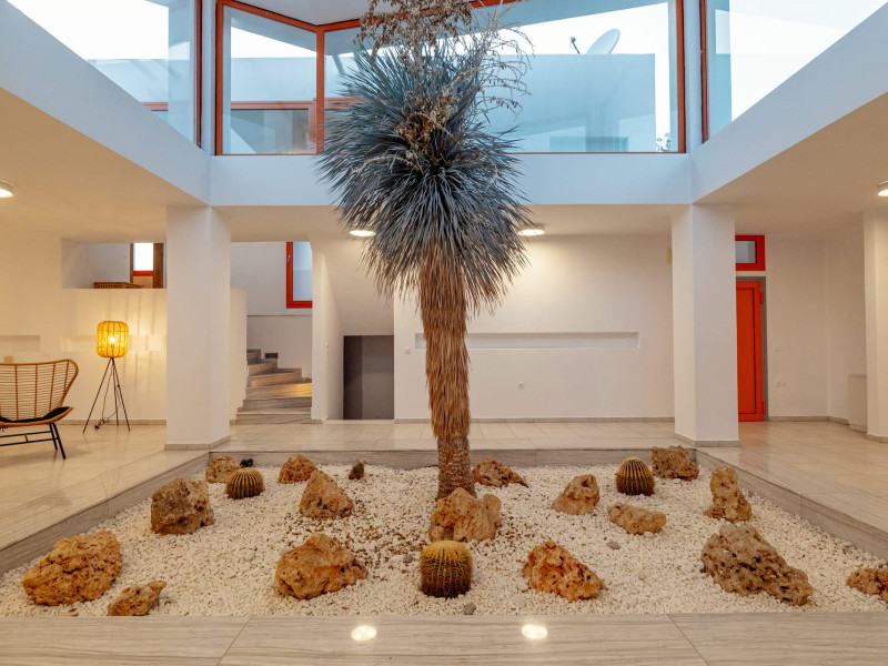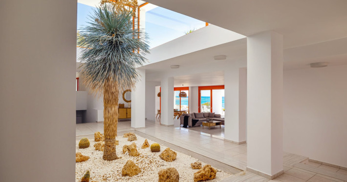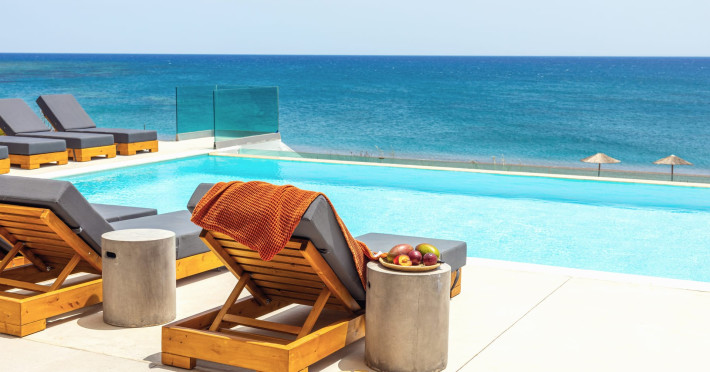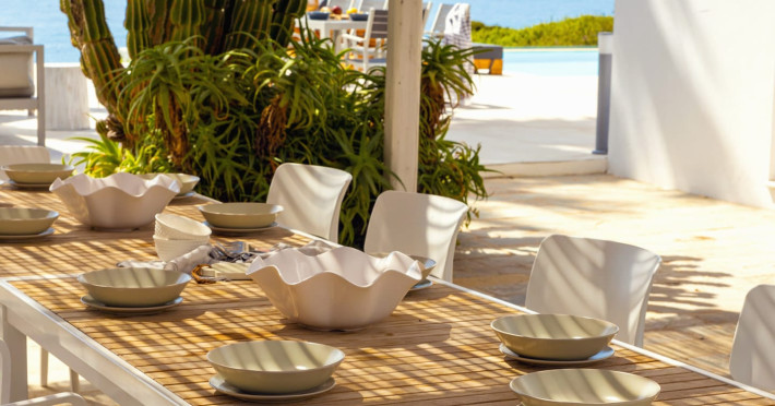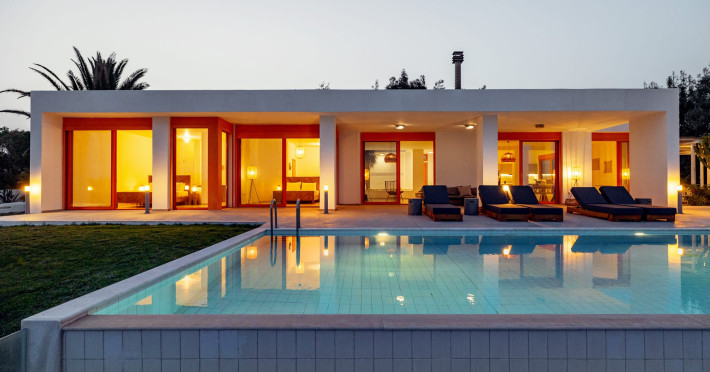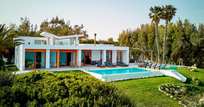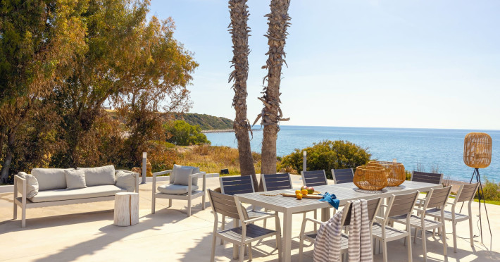 A waterfront 550m2 Villa with 7 spacious double bedrooms offering beautiful sea view as well as one outdoor pool (50 sqm-1.30-1.70 depth). Villa Seven comfortably accommodates up to 14 people and offers individual A/C and heating in 6 bedrooms, spacious living room area with TV (Satellite /Cable) and fireplace for winter months, fully equipped modern kitchen and dining area with baby sit, 7 bathrooms with shower, cosmetic mirror, bathroom amenities, towels & linen, hairdryers, safety box, balconies and sitting areas, garden, terrace, deck chairs and umbrellas, full sea view from all spaces of the property. Welcome basket with local drinks and homemade products upon arrival.