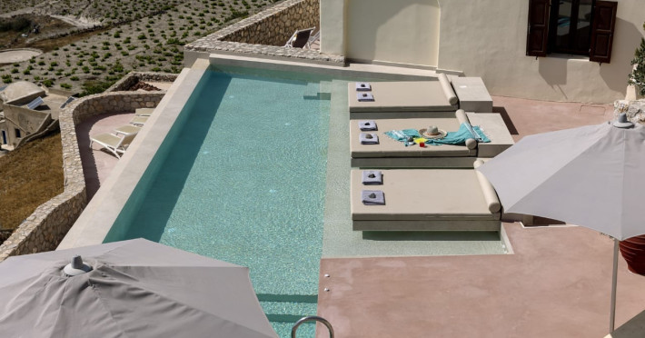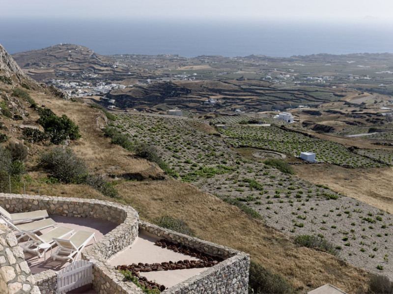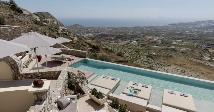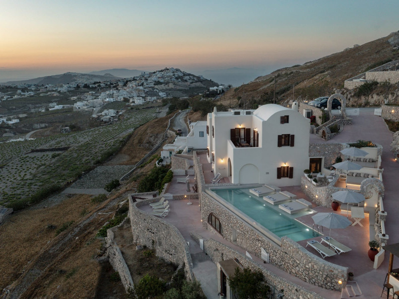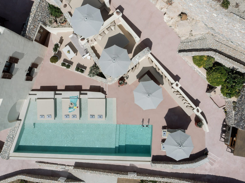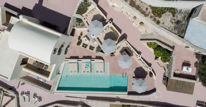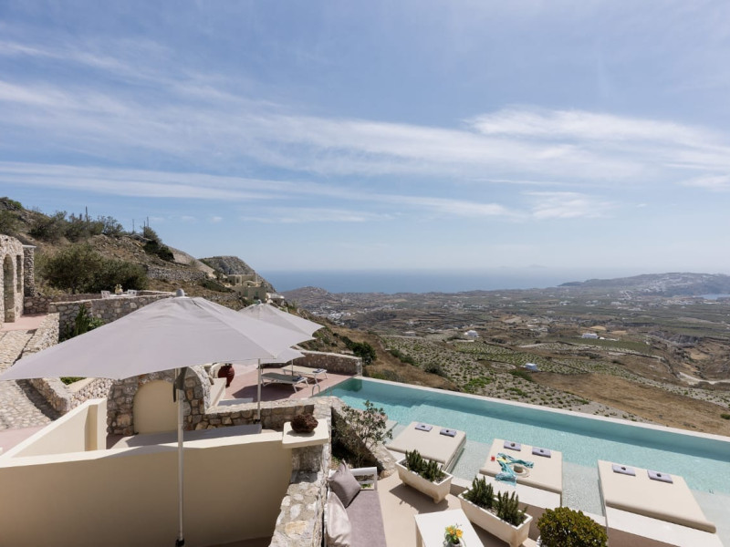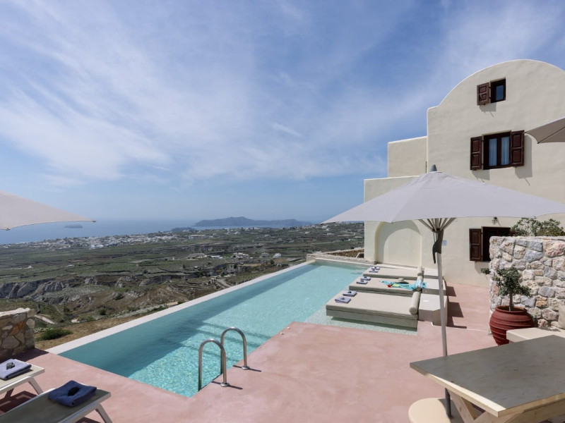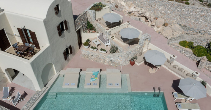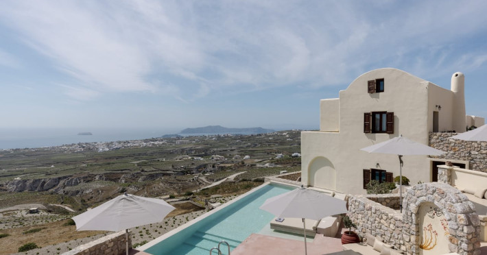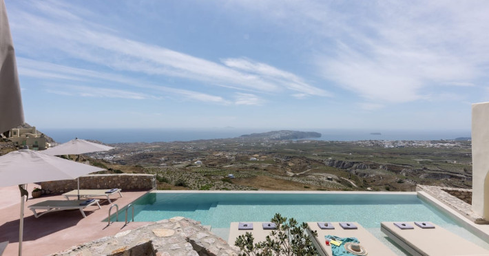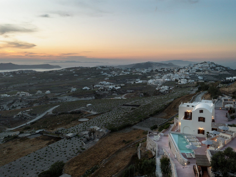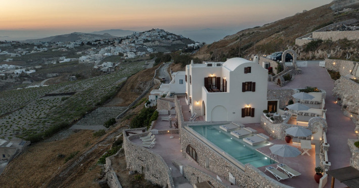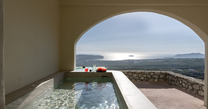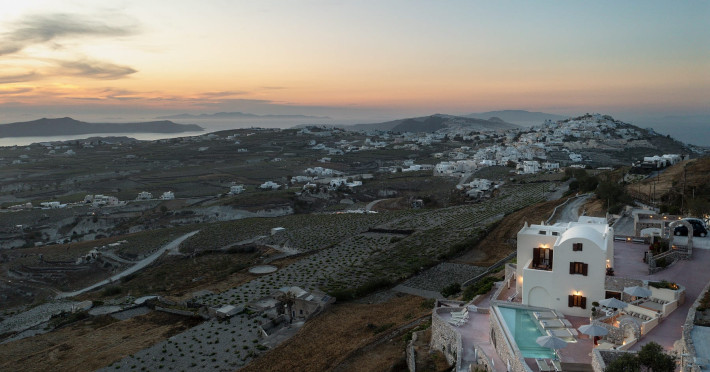 Zatrikion is located on the outskirts of Pyrgos village towards the monastery of Prophitis Ilias, on a very privileged spot, with a sensational view of Santorini Island and the Aegean Sea. Spacious & elegantly decorated with fully equipped kitchen, lounge area and bedrooms each villa has its own unique decoration. Four out of seven of Villas are equipped with a private outdoor heated Jacuzzi & can accommodate families, couples or friends. From the terrace & main pool the view onto the vineyards and the Aegean is breathtaking.