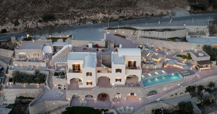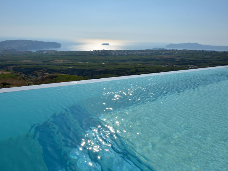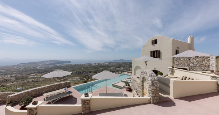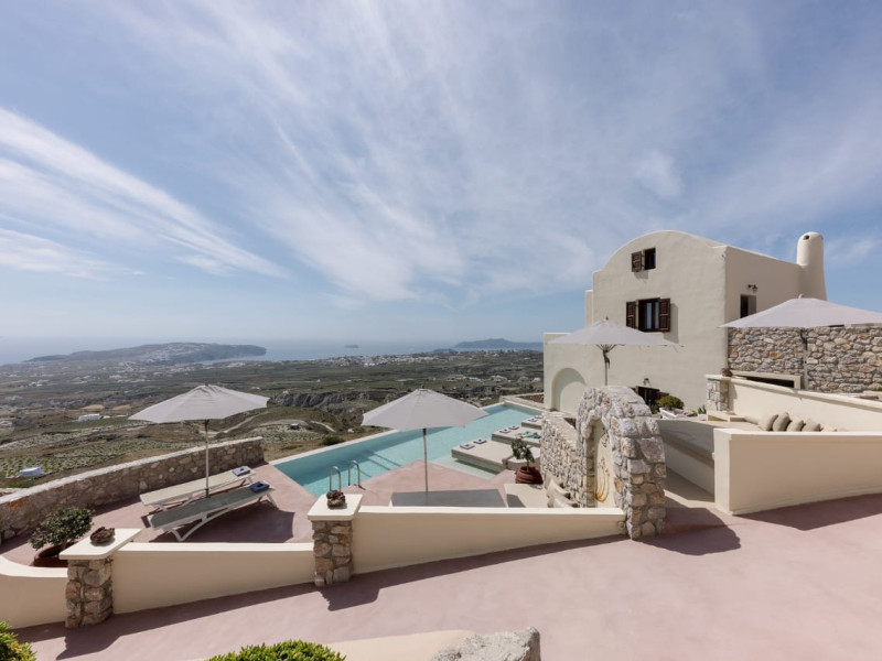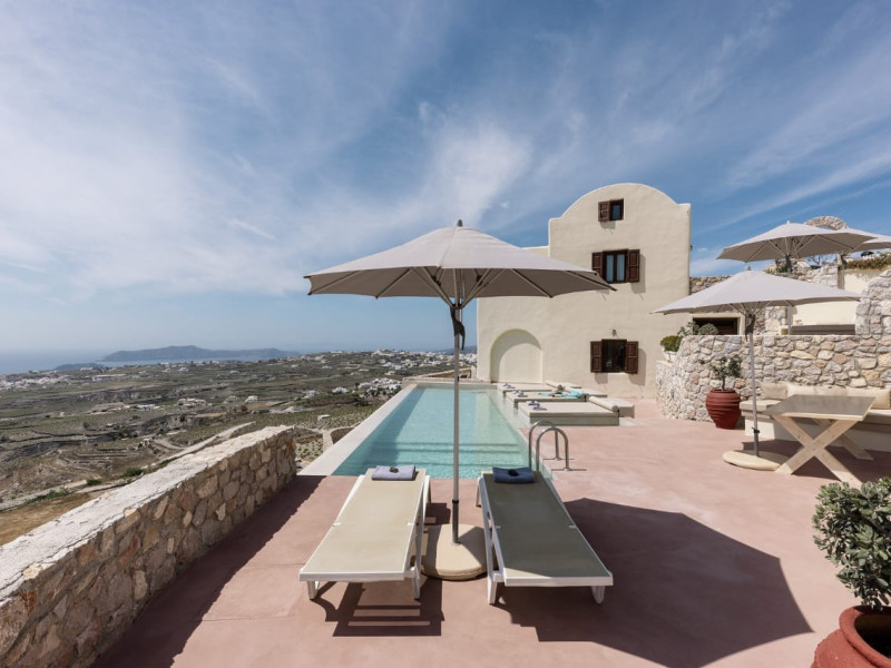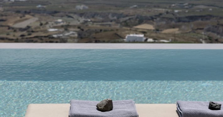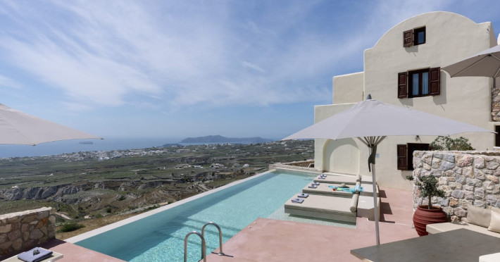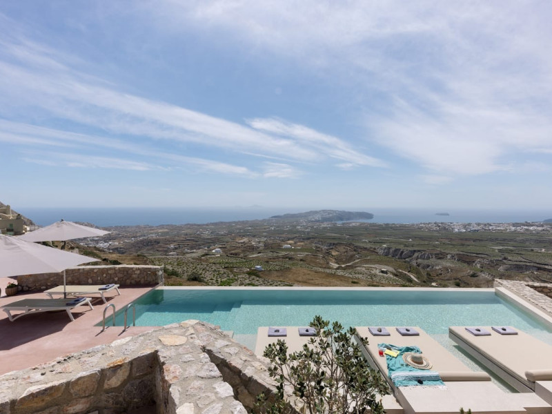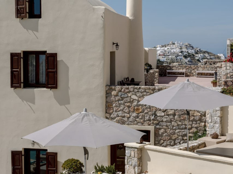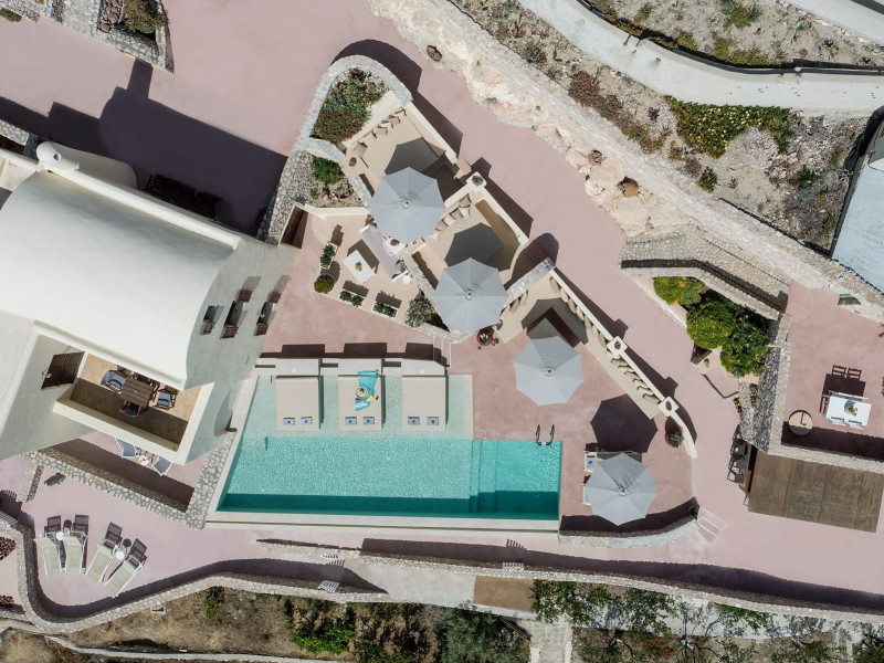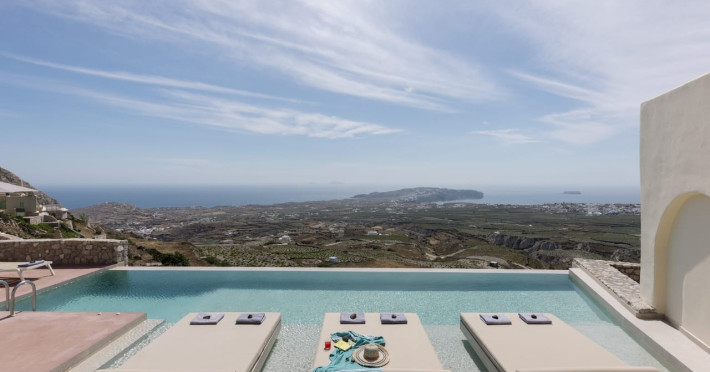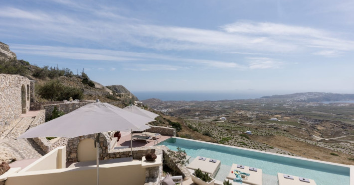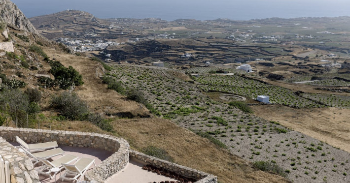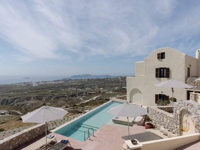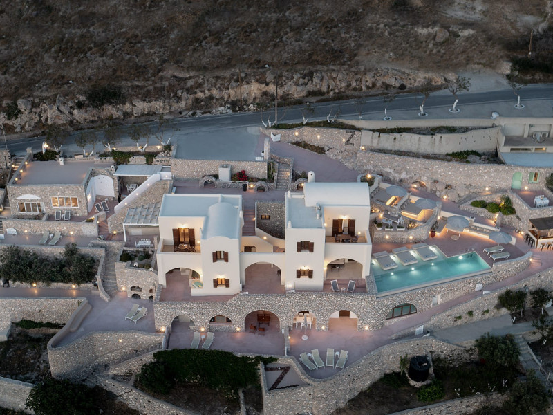 Zatrikion is located on the outskirts of Pyrgos village towards the monastery of Prophitis Ilias, on a very privileged spot, with a sensational view of Santorini Island and the Aegean Sea. Spacious & elegantly decorated with fully equipped kitchen, lounge area and bedrooms each villa has its own unique decoration. Four out of seven of Villas are equipped with a private outdoor heated Jacuzzi & can accommodate families, couples or friends. From the terrace & main pool the view onto the vineyards and the Aegean is breathtaking.