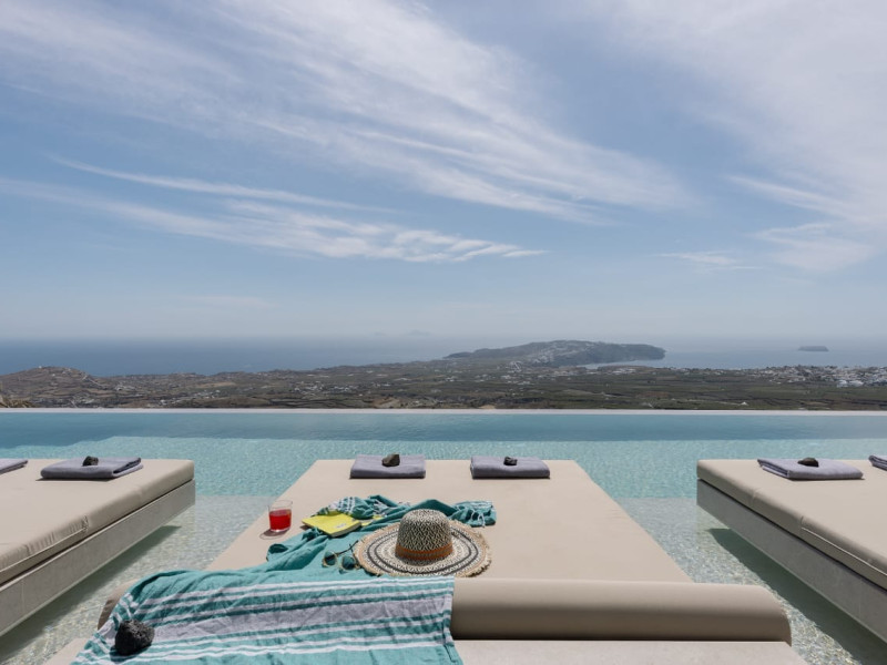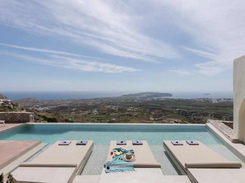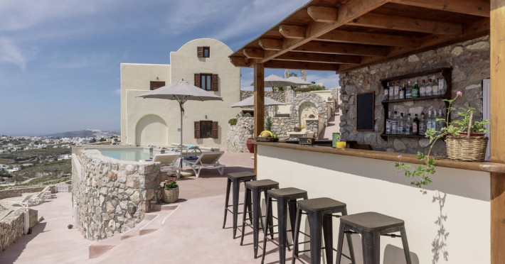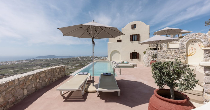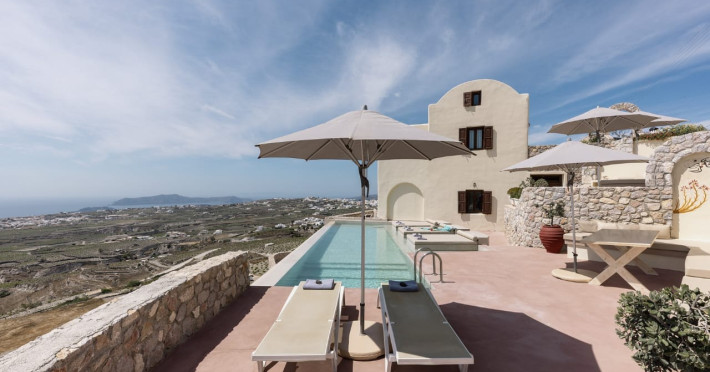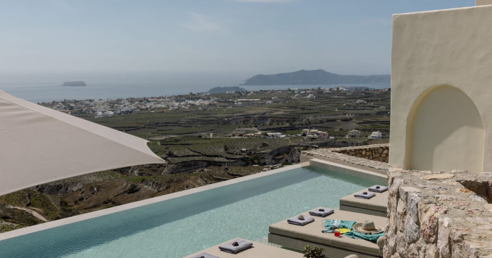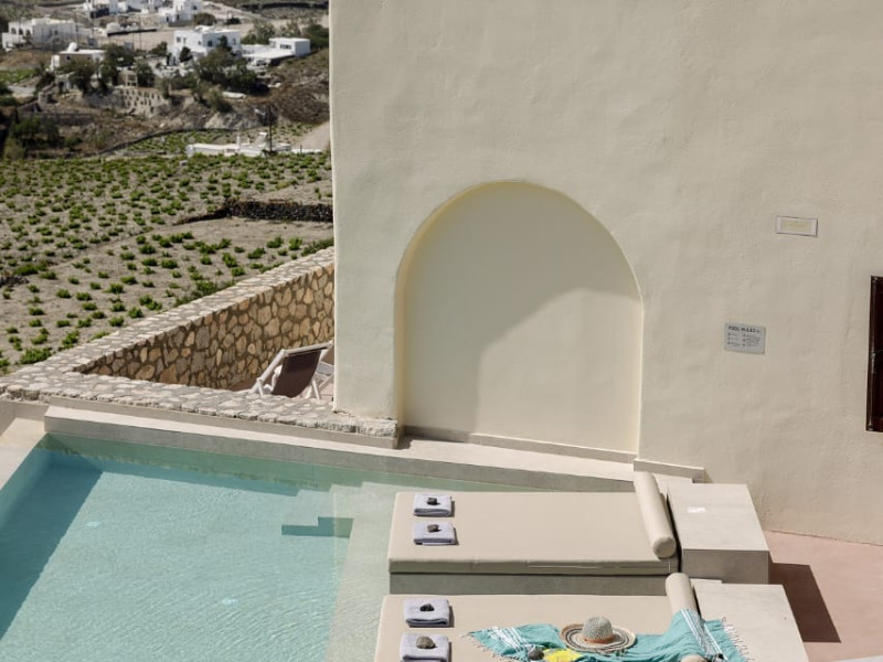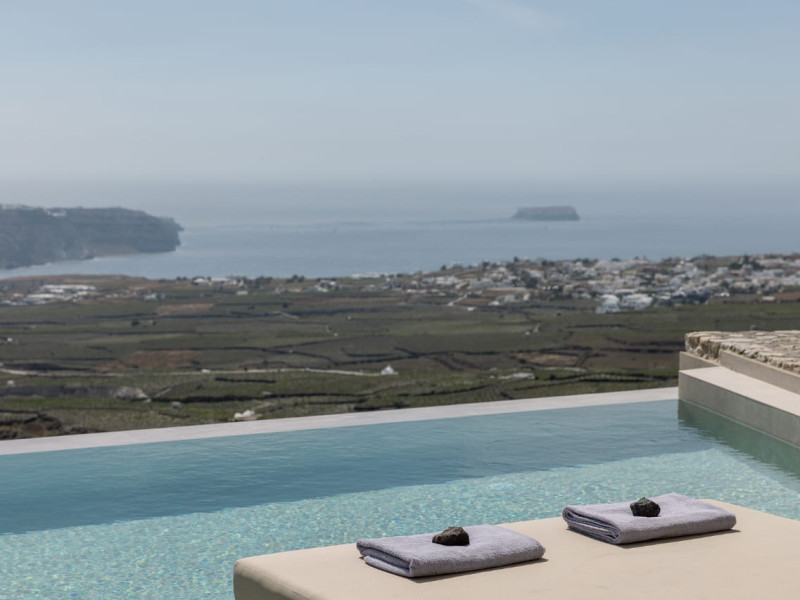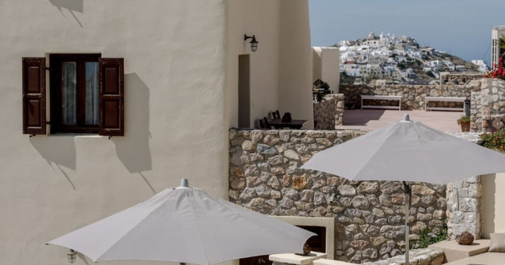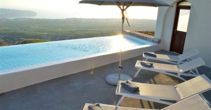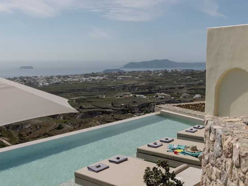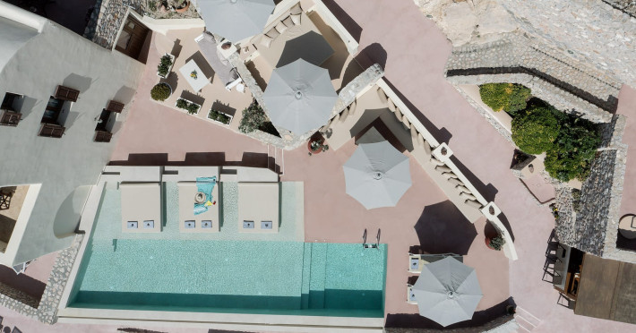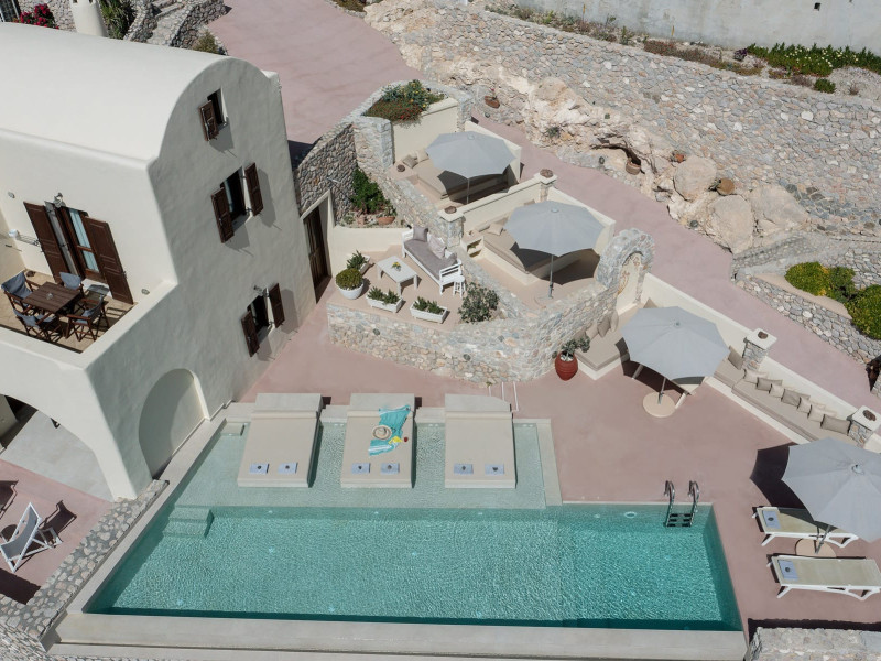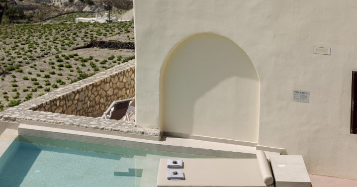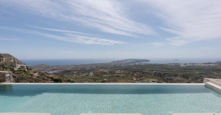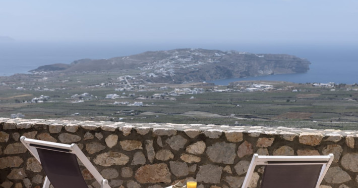 Zatrikion is located on the outskirts of Pyrgos village towards the monastery of Prophitis Ilias, on a very privileged spot, with a sensational view of Santorini Island and the Aegean Sea. Spacious & elegantly decorated with fully equipped kitchen, lounge area and bedrooms each villa has its own unique decoration. Four out of seven of Villas are equipped with a private outdoor heated Jacuzzi & can accommodate families, couples or friends. From the terrace & main pool the view onto the vineyards and the Aegean is breathtaking.