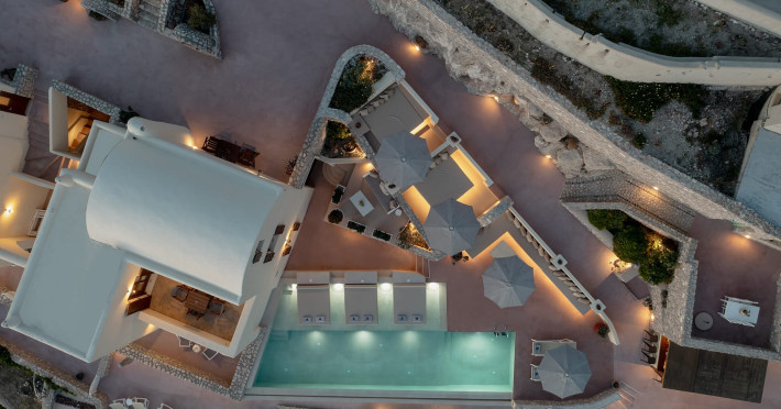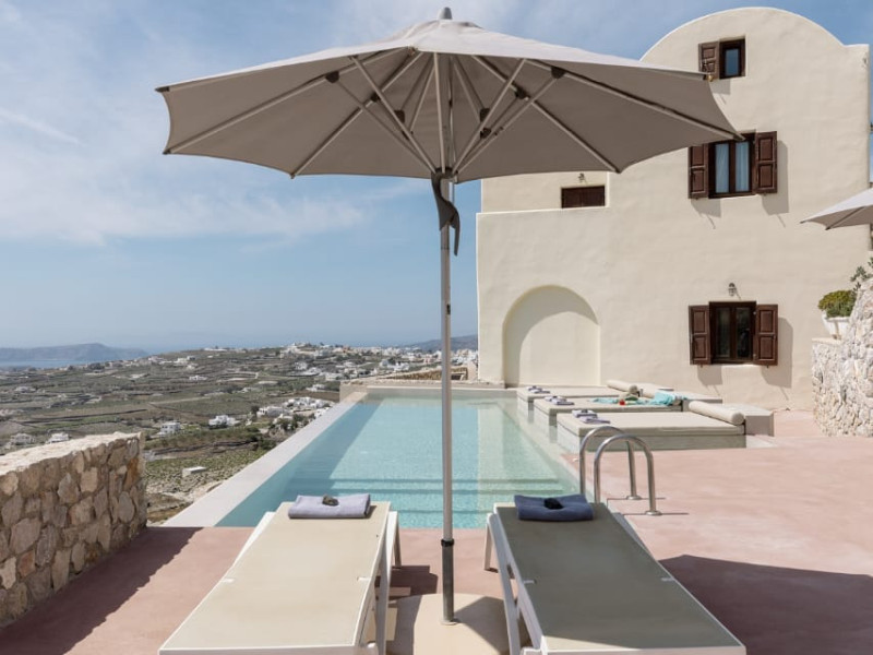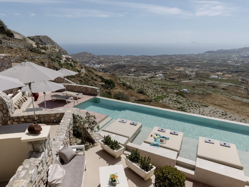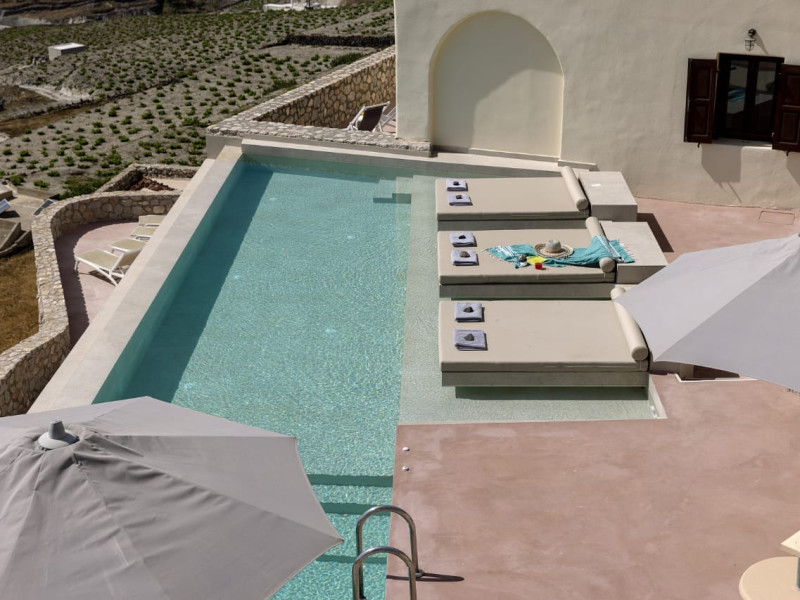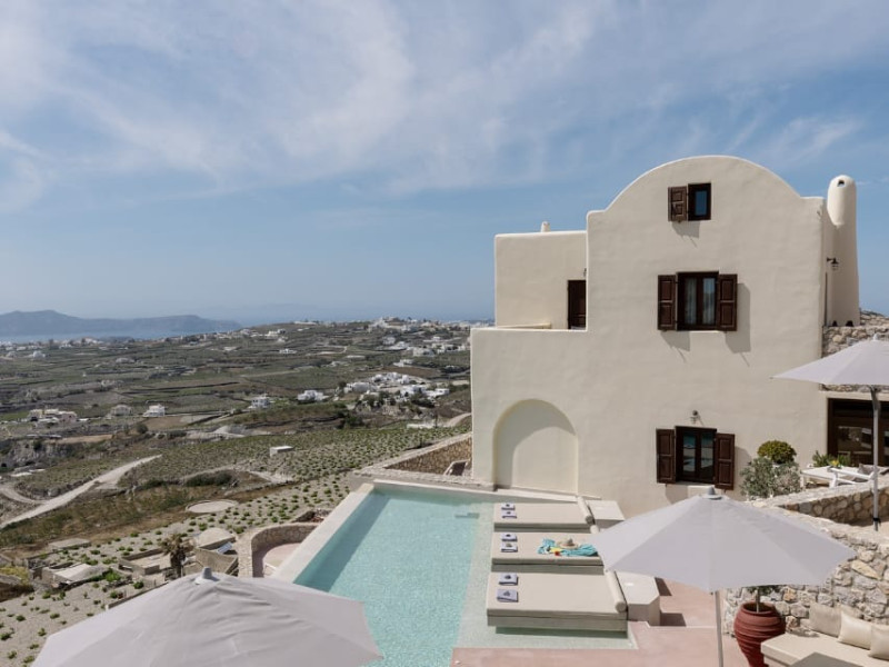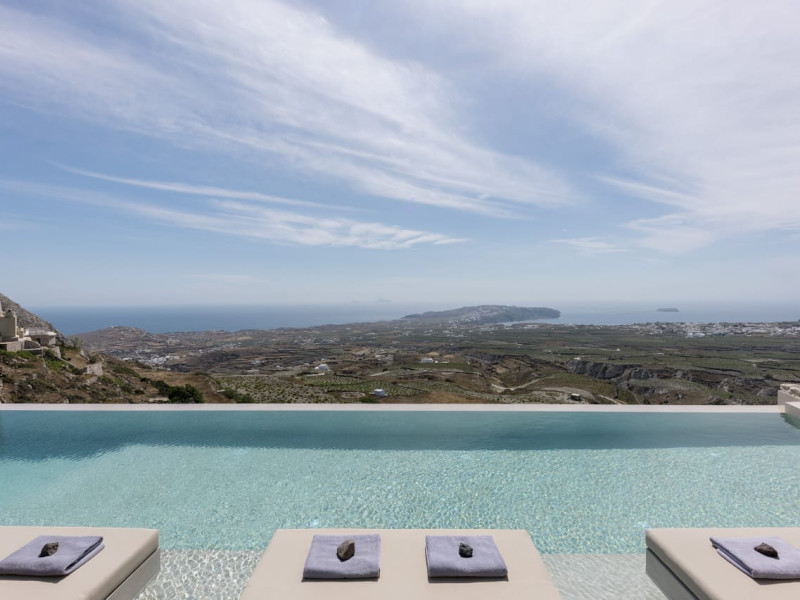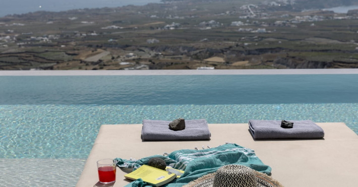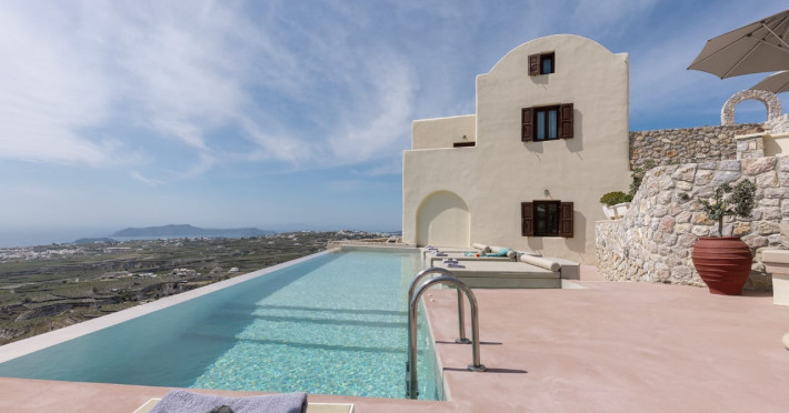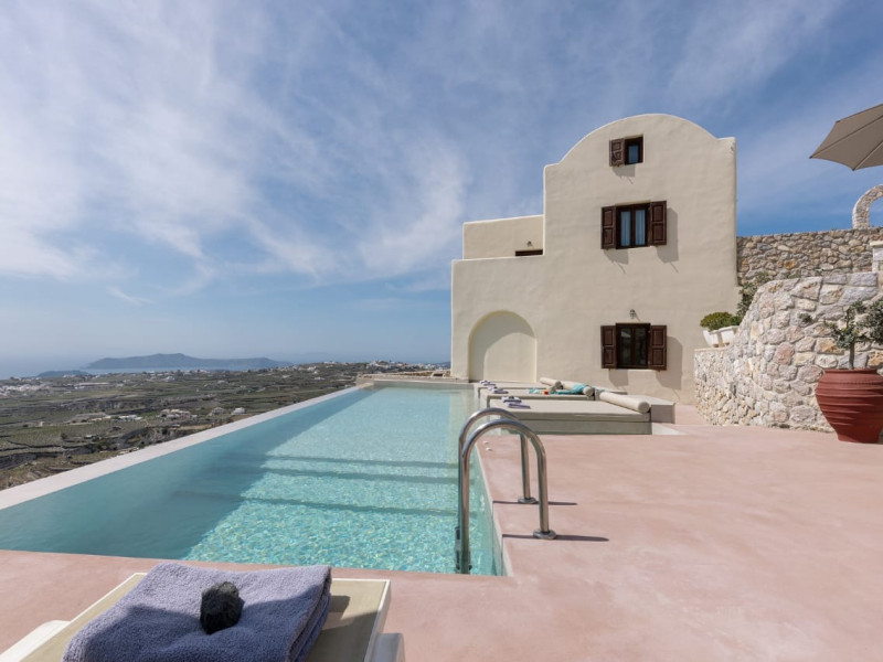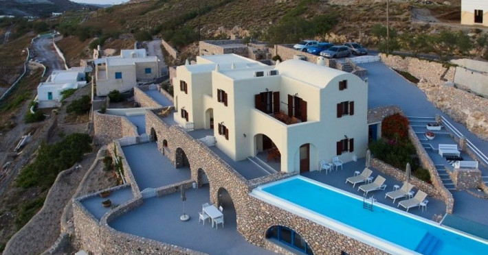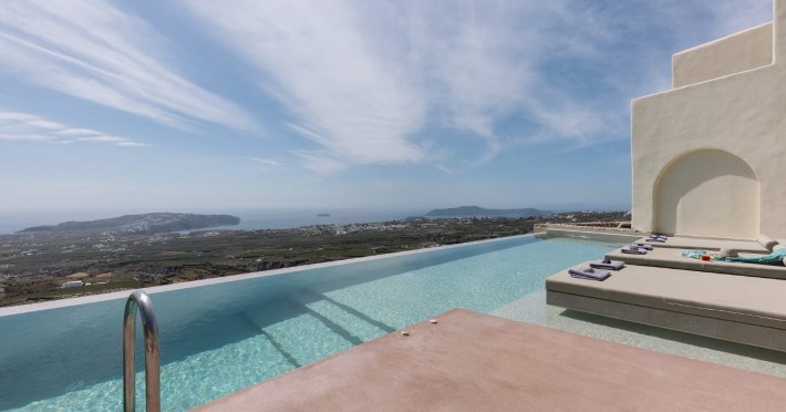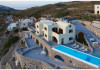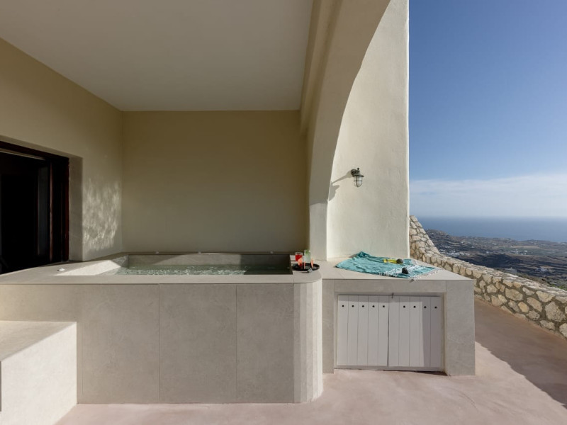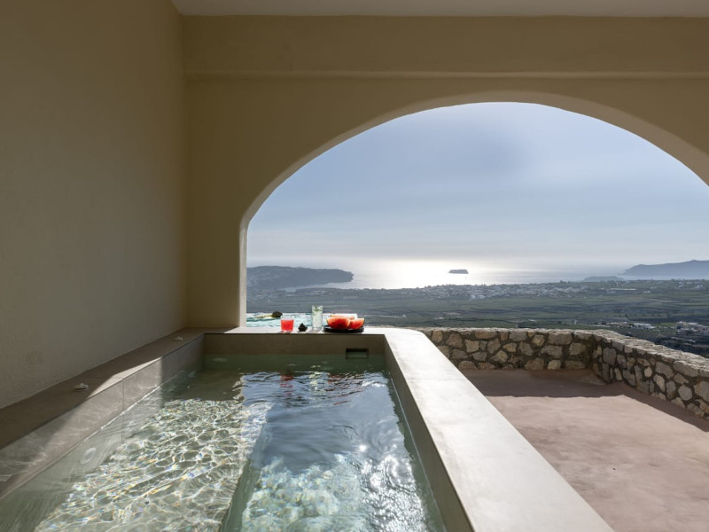Zatrikion is located on the outskirts of Pyrgos village towards the monastery of Prophitis Ilias, on a very privileged spot, with a sensational view of Santorini Island and the Aegean Sea. Spacious & elegantly decorated with fully equipped kitchen, lounge area and bedrooms each villa has its own unique decoration. Four out of seven of Villas are equipped with a private outdoor heated Jacuzzi & can accommodate families, couples or friends. From the terrace & main pool the view onto the vineyards and the Aegean is breathtaking.