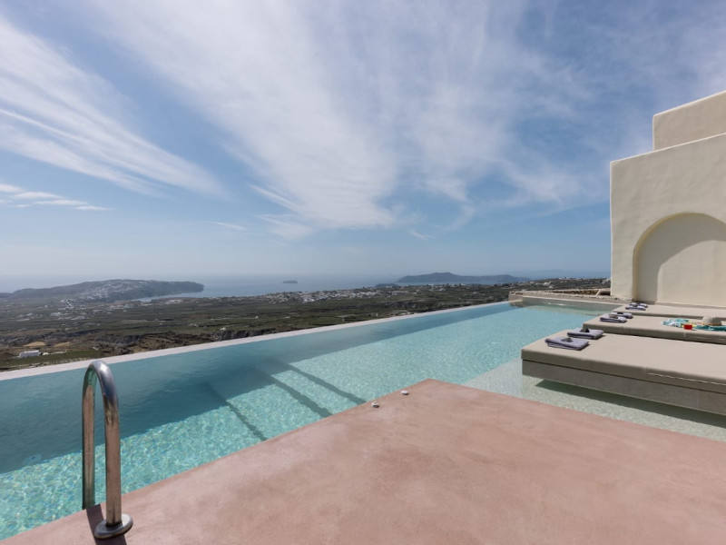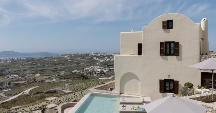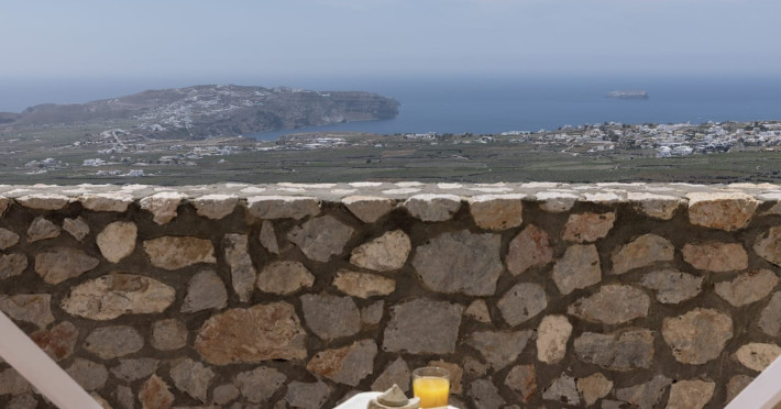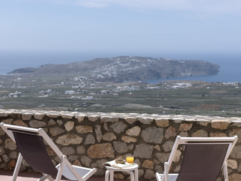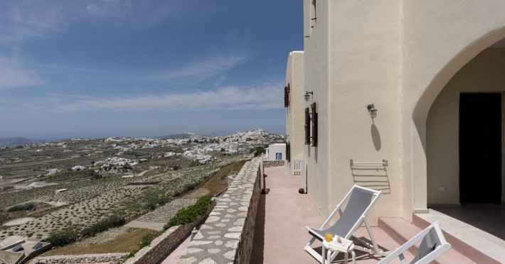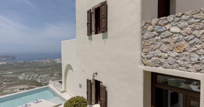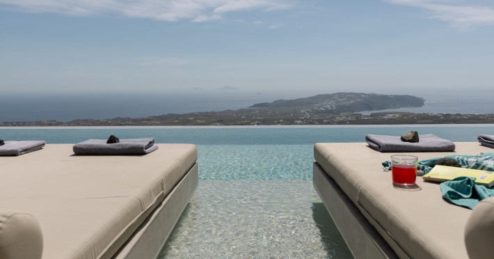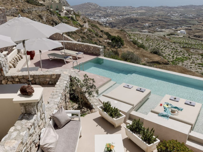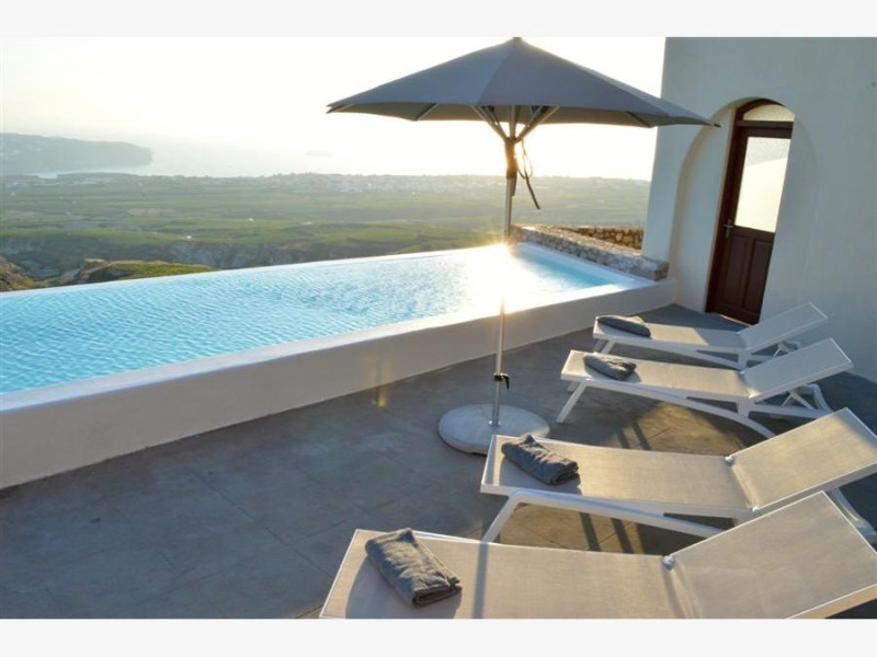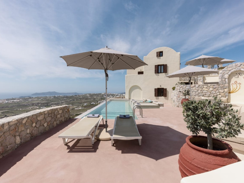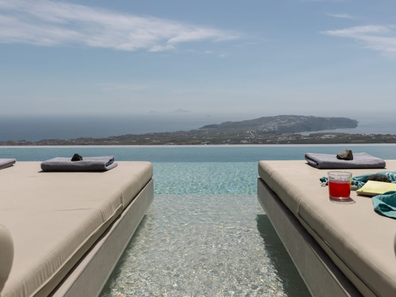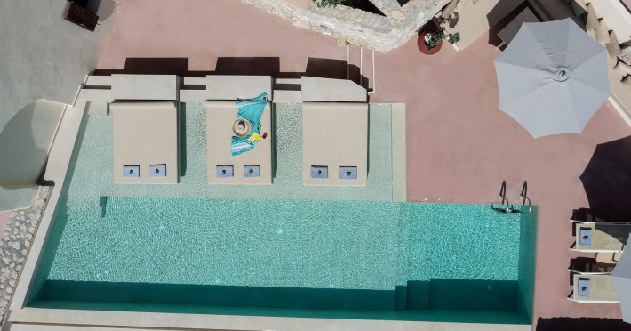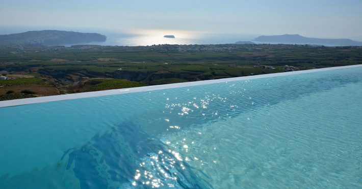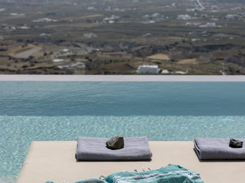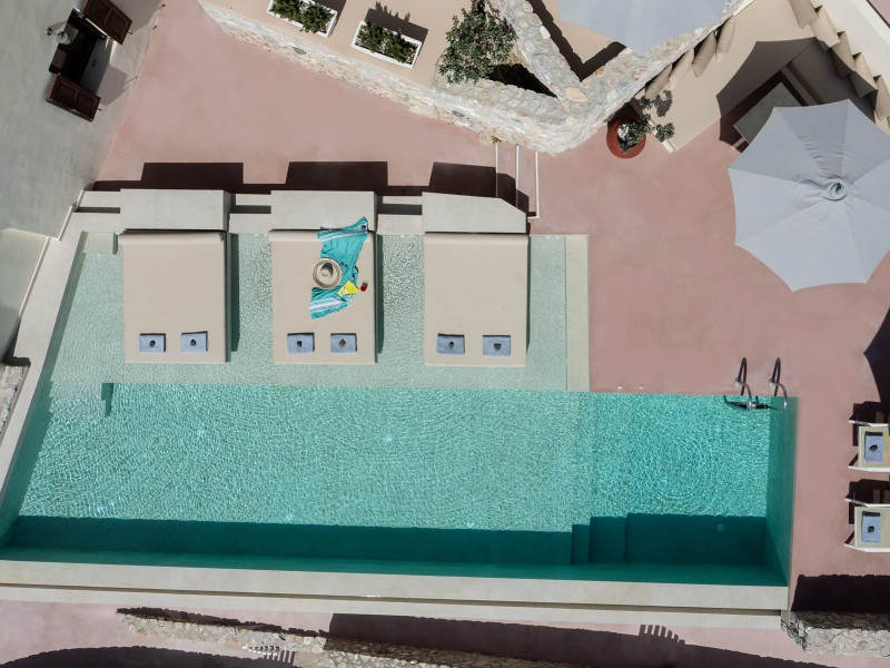 Zatrikion is located on the outskirts of Pyrgos village towards the monastery of Prophitis Ilias, on a very privileged spot, with a sensational view of Santorini Island and the Aegean Sea. Spacious & elegantly decorated with fully equipped kitchen, lounge area and bedrooms each villa has its own unique decoration. Four out of seven of Villas are equipped with a private outdoor heated Jacuzzi & can accommodate families, couples or friends. From the terrace & main pool the view onto the vineyards and the Aegean is breathtaking.