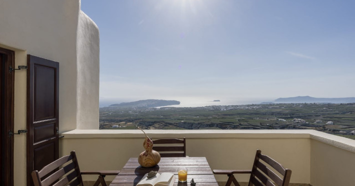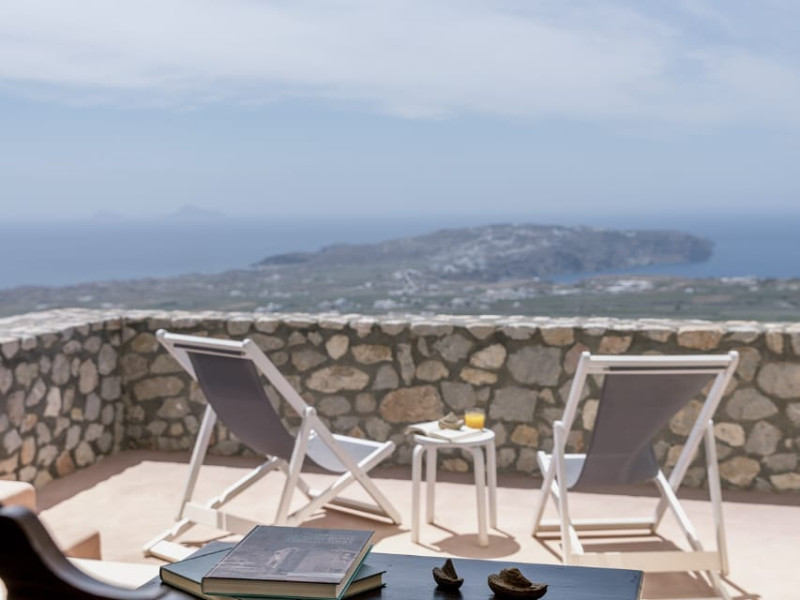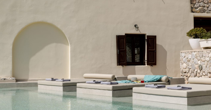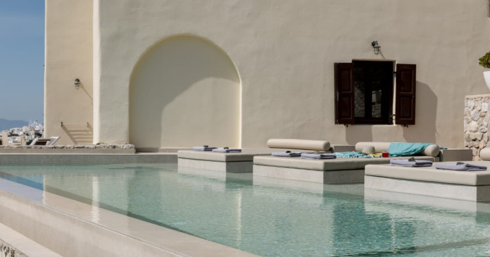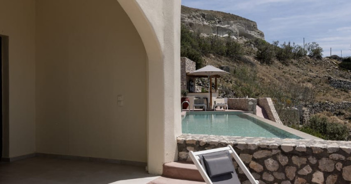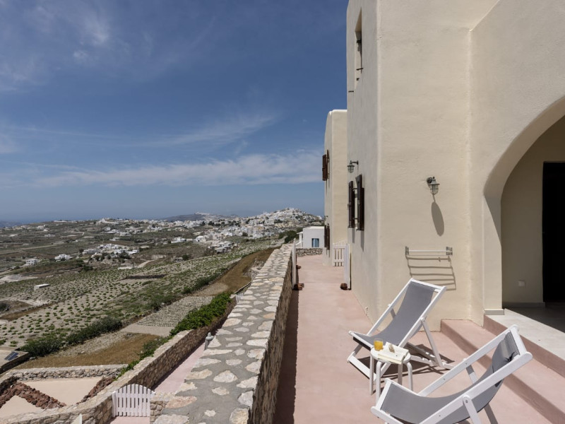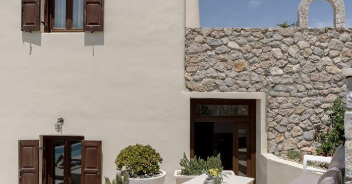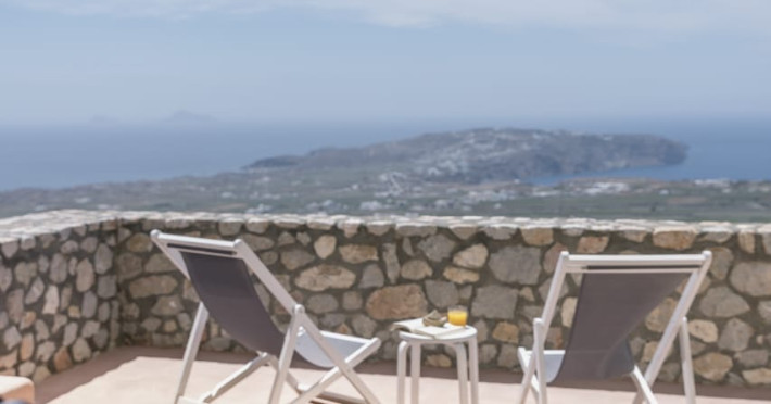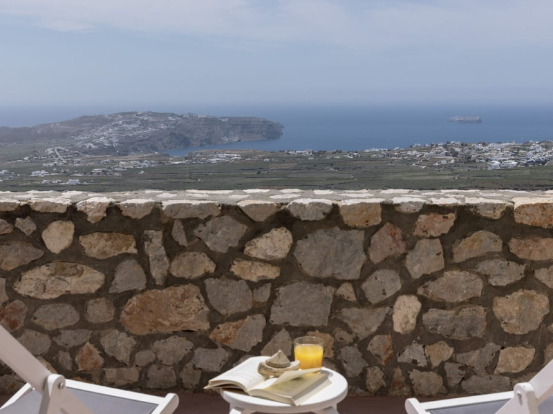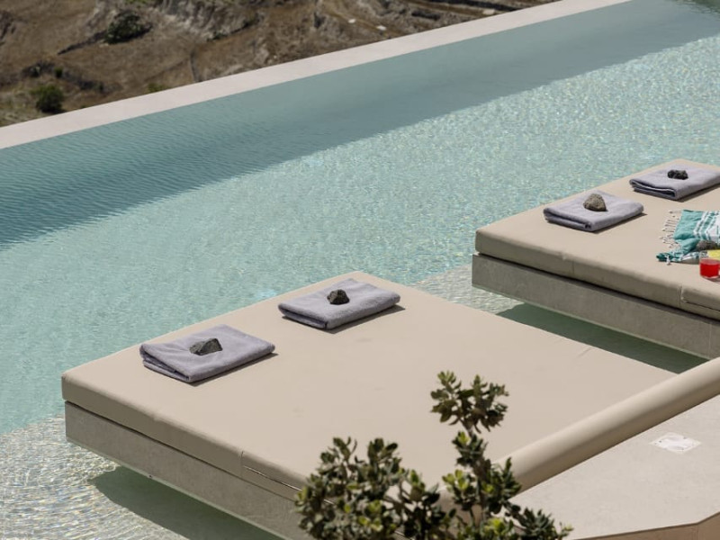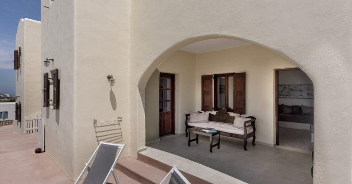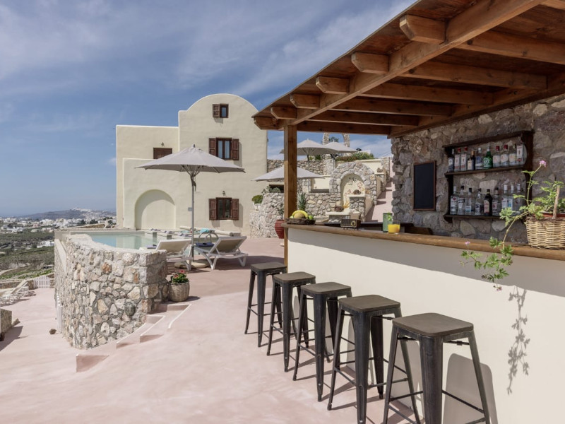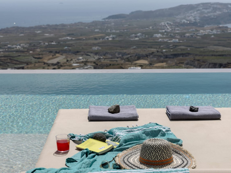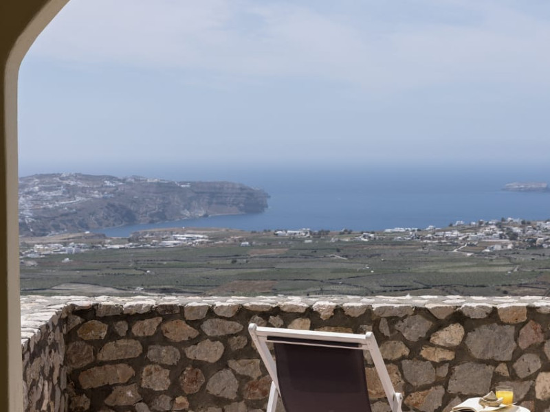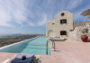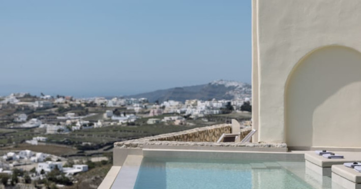 Zatrikion is located on the outskirts of Pyrgos village towards the monastery of Prophitis Ilias, on a very privileged spot, with a sensational view of Santorini Island and the Aegean Sea. Spacious & elegantly decorated with fully equipped kitchen, lounge area and bedrooms each villa has its own unique decoration. Four out of seven of Villas are equipped with a private outdoor heated Jacuzzi & can accommodate families, couples or friends. From the terrace & main pool the view onto the vineyards and the Aegean is breathtaking.