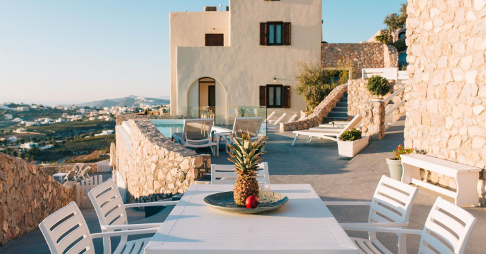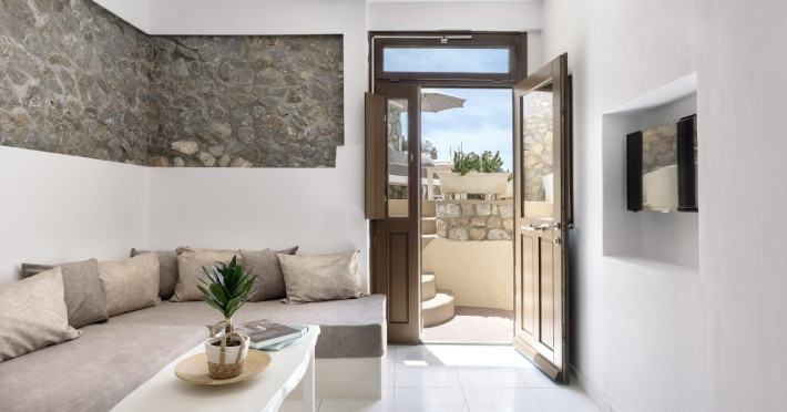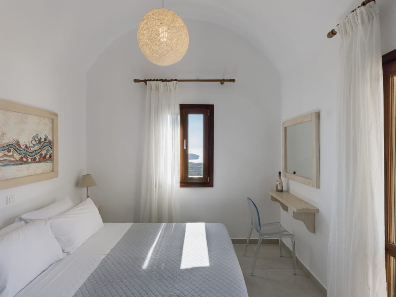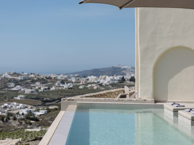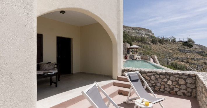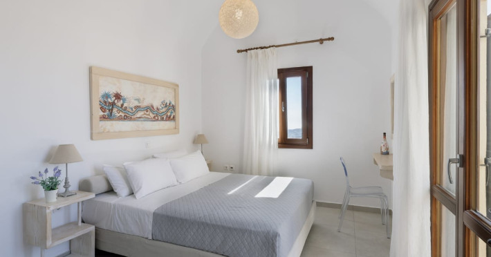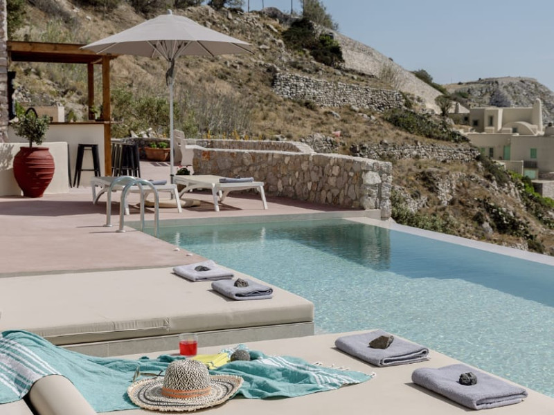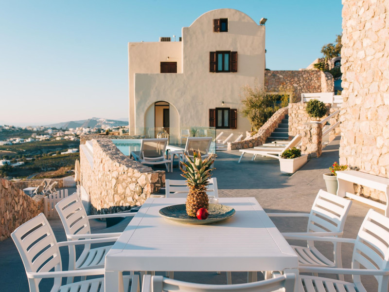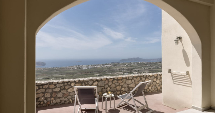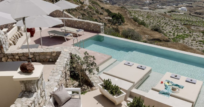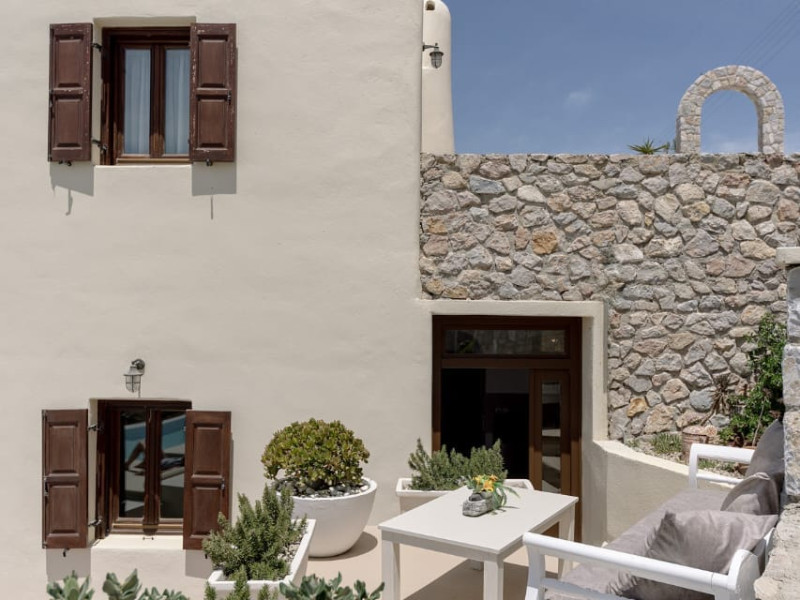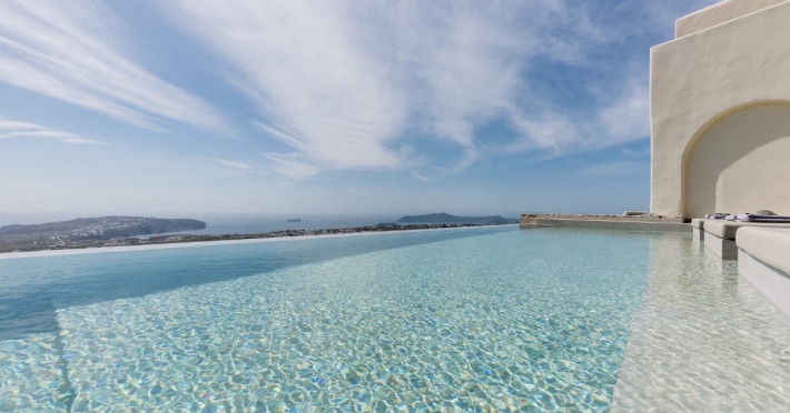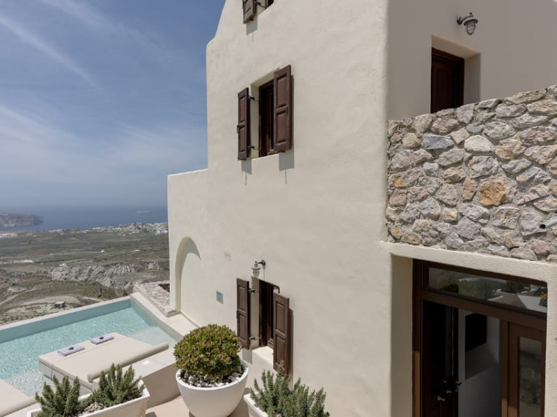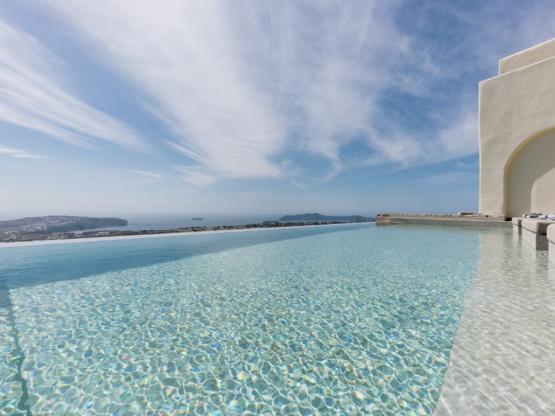 Zatrikion is located on the outskirts of Pyrgos village towards the monastery of Prophitis Ilias, on a very privileged spot, with a sensational view of Santorini Island and the Aegean Sea. Spacious & elegantly decorated with fully equipped kitchen, lounge area and bedrooms each villa has its own unique decoration. Four out of seven of Villas are equipped with a private outdoor heated Jacuzzi & can accommodate families, couples or friends. From the terrace & main pool the view onto the vineyards and the Aegean is breathtaking.
